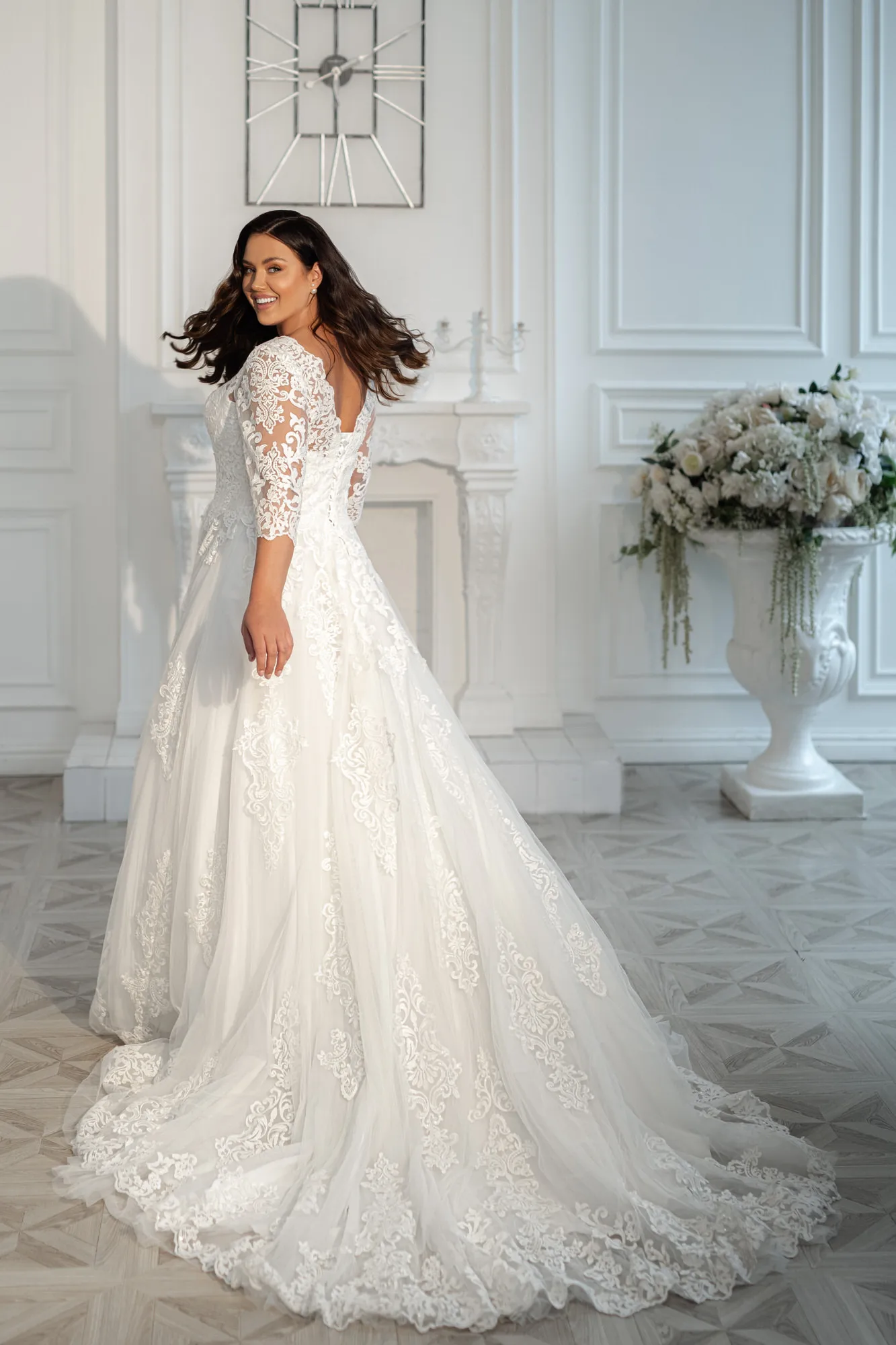 Свадебное платье с юбкой-годе, вырезом лодочкой и аппликацией, рука...