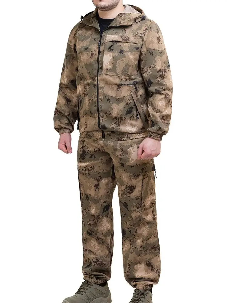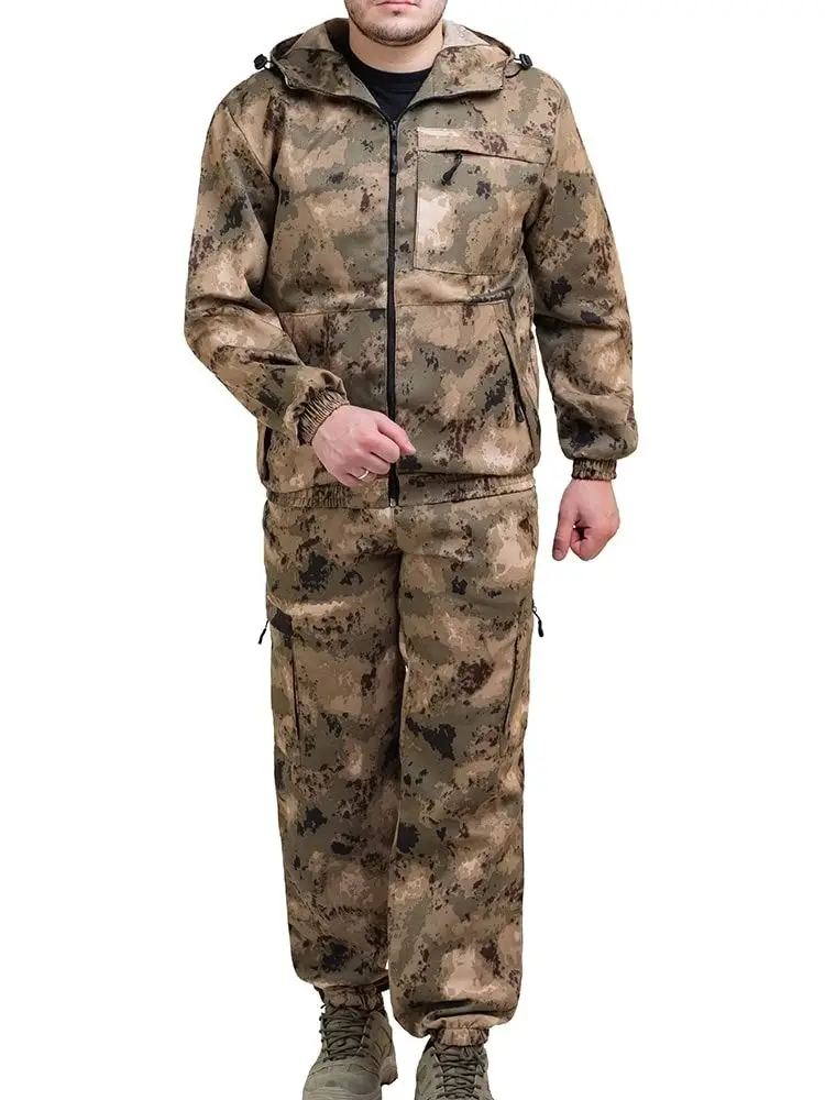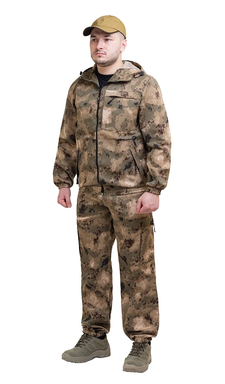Камуфлированный универсальный летний костюм для охоты, рыбалки и активного отдыха . Состоит из куртки с капюшоном и брюк. Куртка: - Регулируемый капюшон. - Центральная застежка молния. - Боковые и нагрудный накладные карманы на молнии. - Низ куртки и манжеты на резинке. Брюки: - Два врезных кармана и два накладных кармана на молнии. - Пояс и низ брюк на резинке.