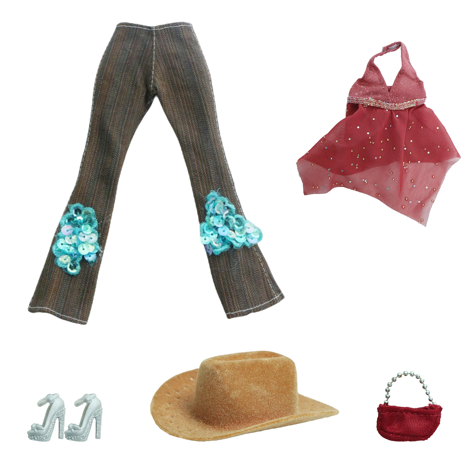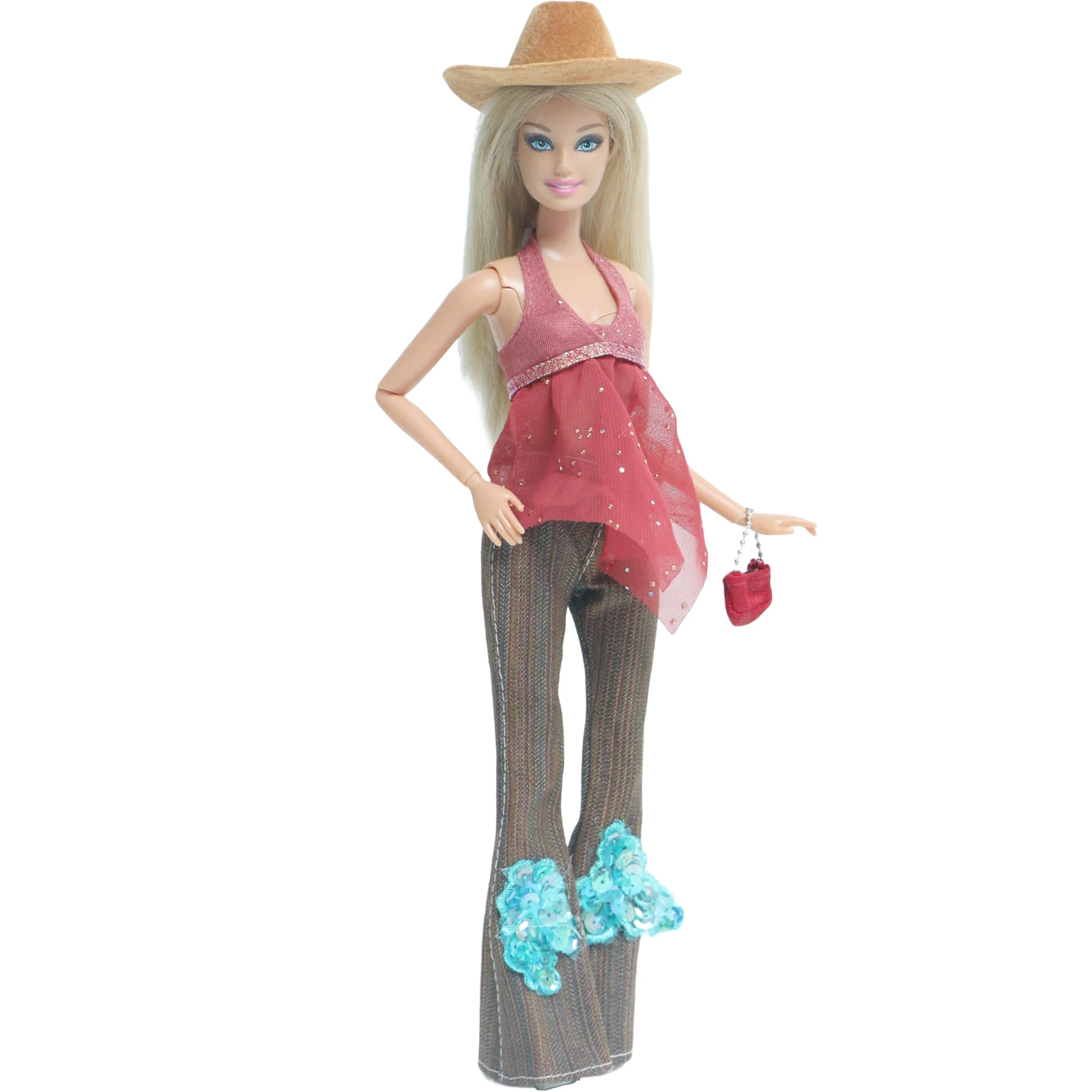 Новейший наряд для куклы BJDBUS, крутая ковбойская шляпа, с лямкой на шее, топы, брюки, мини-сумочка, обувь на высоком каблуке, Одежда для куклы Барби, аксессуары