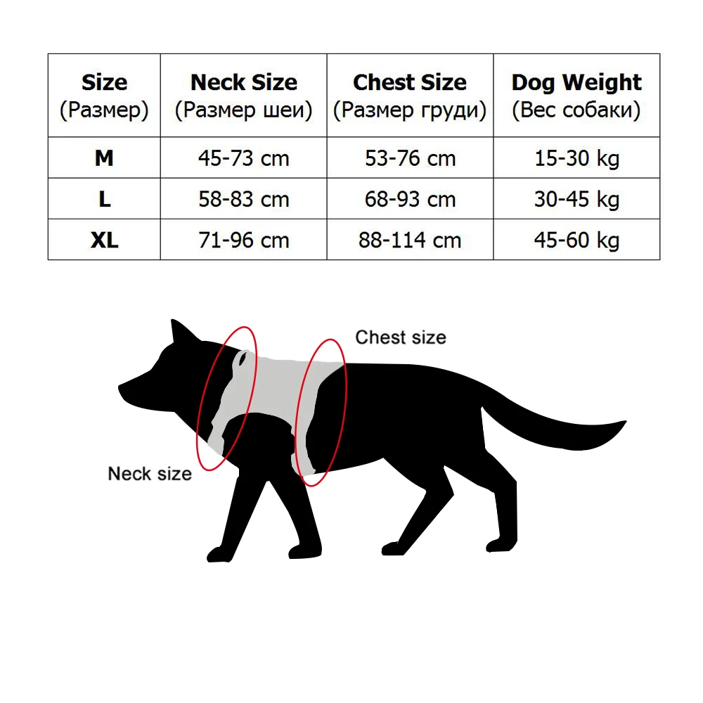 Измерьте обхват груди вашей собаки, чтобы подобрать подходящий размер. (Таблица размеров приведена на рисунке)