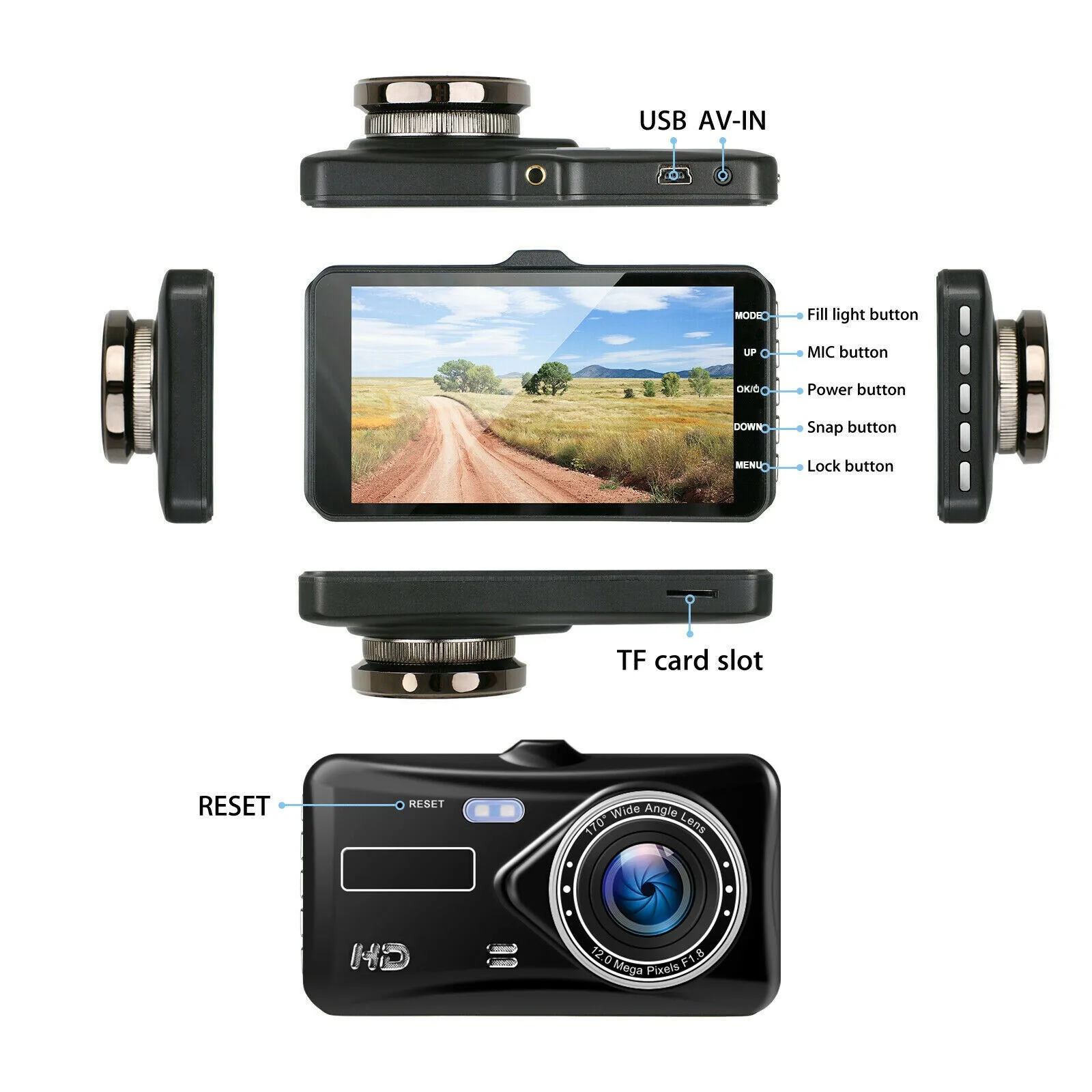 * Видео высокой четкости с низким освещением, двойная камера 1080P и 720P, фронтальная камера Full HD 1080P(1920*1080), камера заднего вида 720P.