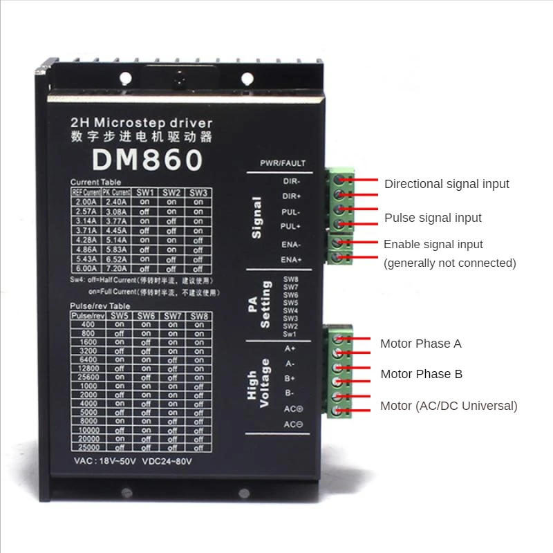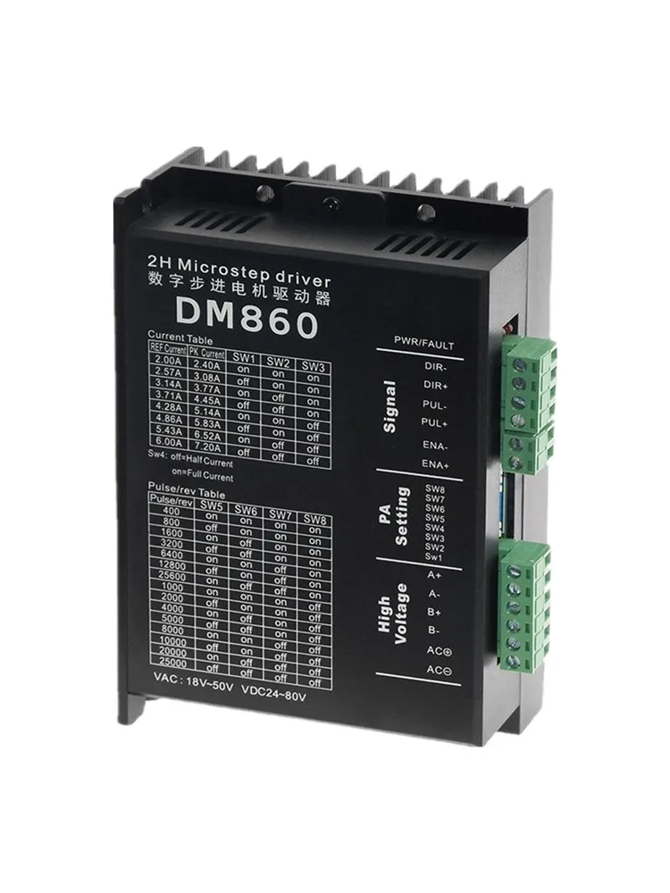 Общий для сигналов 5 В и 24 ВОсобенности:Этот драйвер является DSP цифровой dm860 Драйвер шагового двигателя, который разделен и поднятРаздел to128, подходит для целей высокое подразделение. Подходит для шагового двигателя: 57,86 Тип2-х фазный 4 фазы (4-проводной 6-медный провод 8-провод)1.20v-80v DC / 18v-50v AC источника питания;2.H-bridge биполярный постоянный фазовый токовый привод;3.Восемь выходных токов с током до 7,2 а являются необязательными;4.15 режимов разделения, которые могут быть разделены на 128, являются необязательными;5.Высокоскоростная фотоэлектрическая изоляция входного сигнала;6.Стандартный одноимпульсный интерфейс;7.Автономная функция удержания;8.Полузакрытый корпус может адаптироваться к более тяжелой среде;9.Обеспечивает энергосберегающую полуавтоматическую функцию блокировки тока;10.Встроенная температурная защита и защита от перегрузки по току