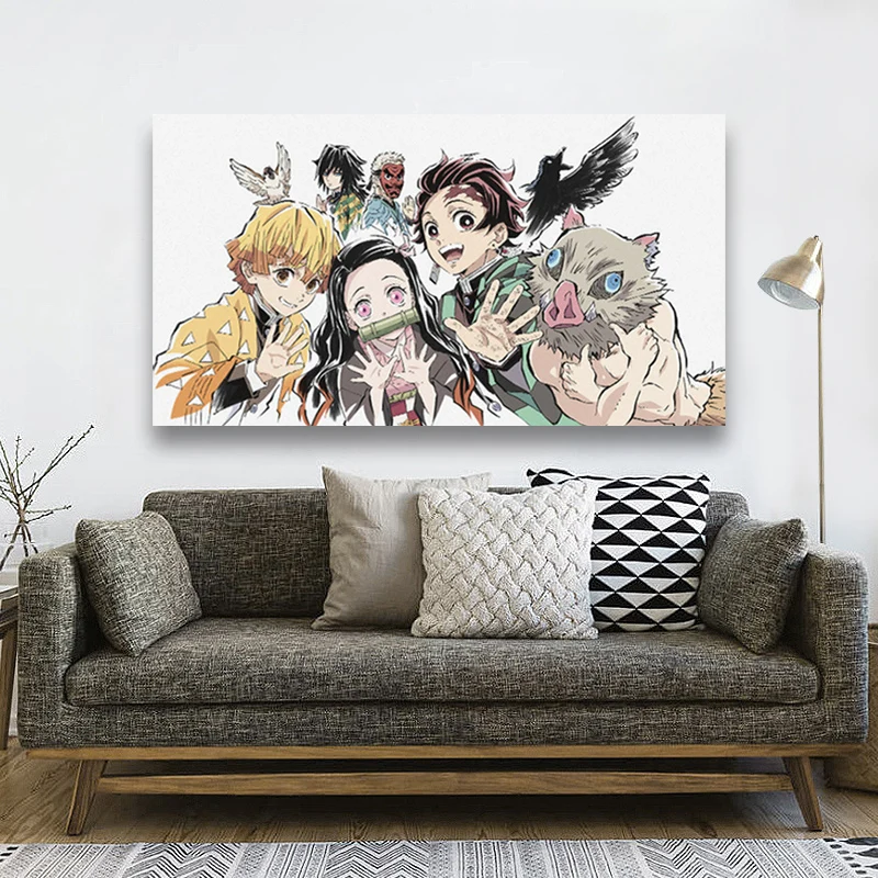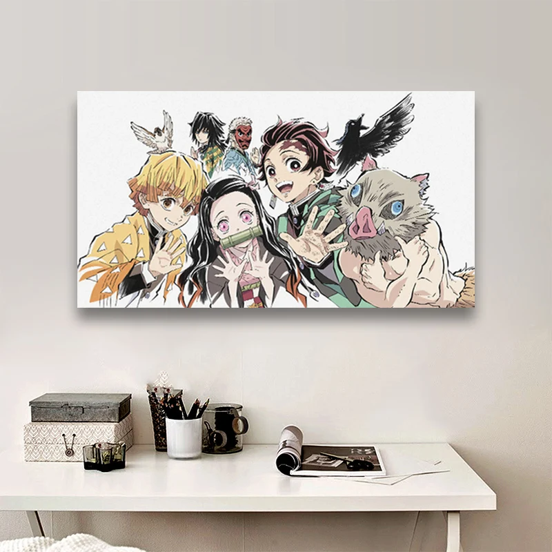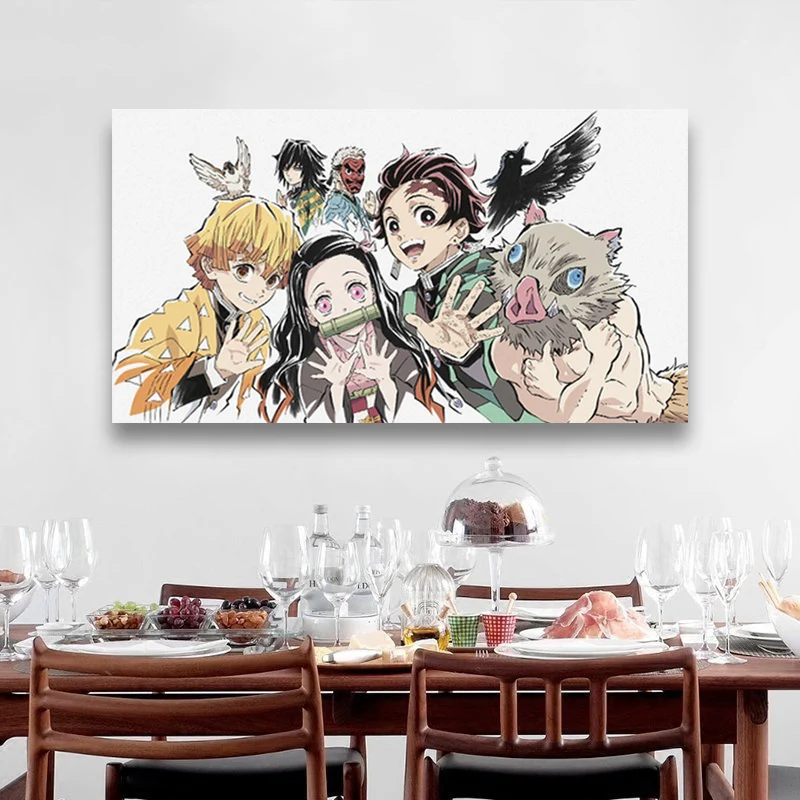Постер Tanjiro Nezuko Zenitsu Inosuke, рассекающий демонов, деревянная рамка, холст, настенное художественное украшение, декор в рамке для спальни
