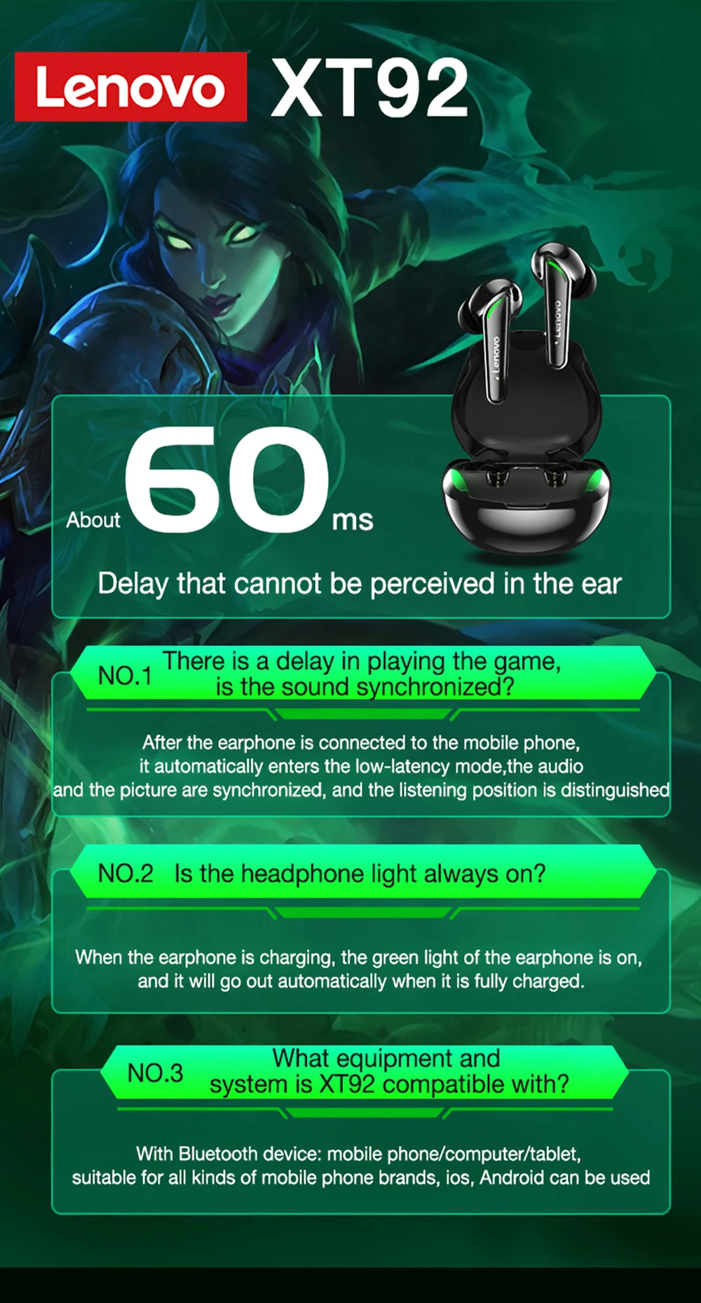 Игровые наушники Lenovo XT92 TWS с низкой задержкой, Беспроводные с...