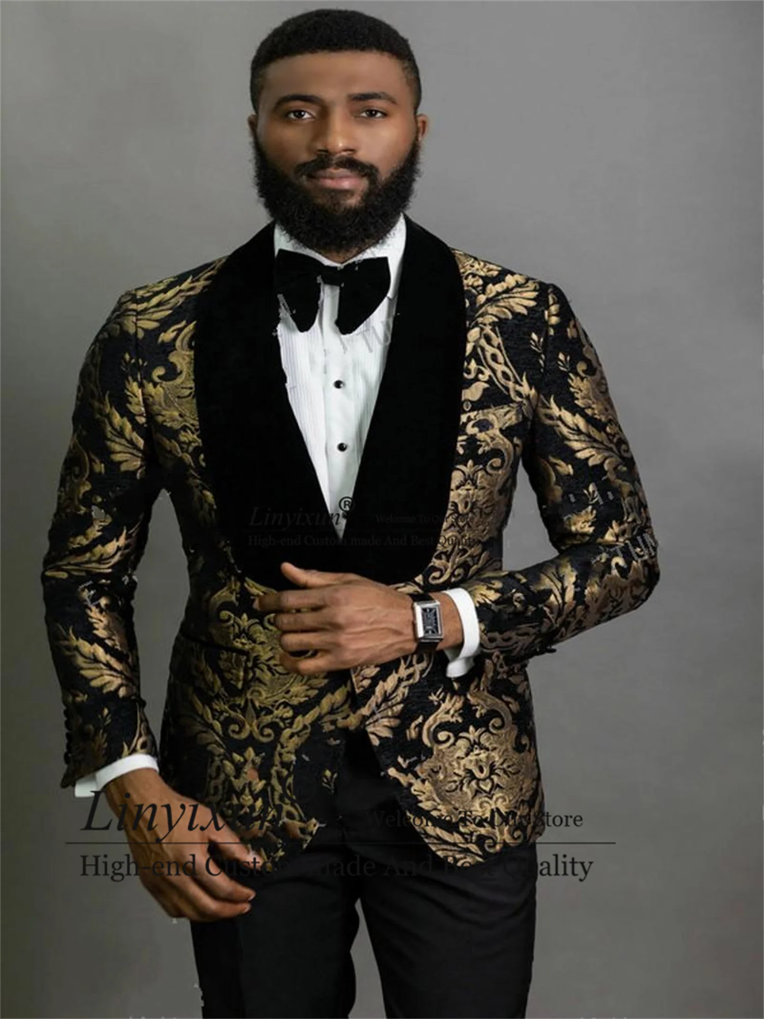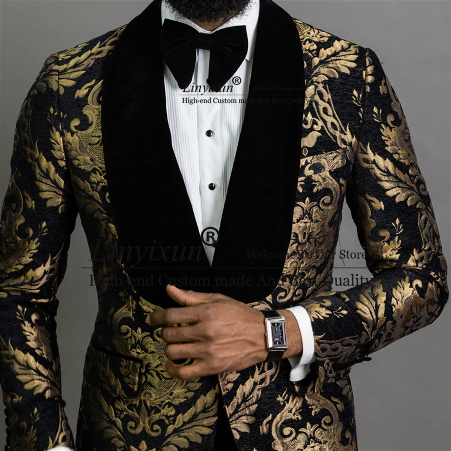 Жаккардовые облегающие мужские костюмы с черным цветочным принтом и бархатной шалью, смокинг для жениха на свадьбу, комплект из 2 предметов, пиджак и брюки, Terno Masculino