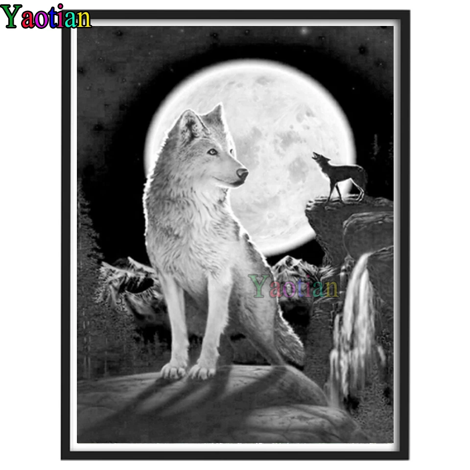 Полностью квадратная/круглая Алмазная картина moon wolf 5D DIY Алмазная вышивка Стразы мозаика черно-белое животное водопад