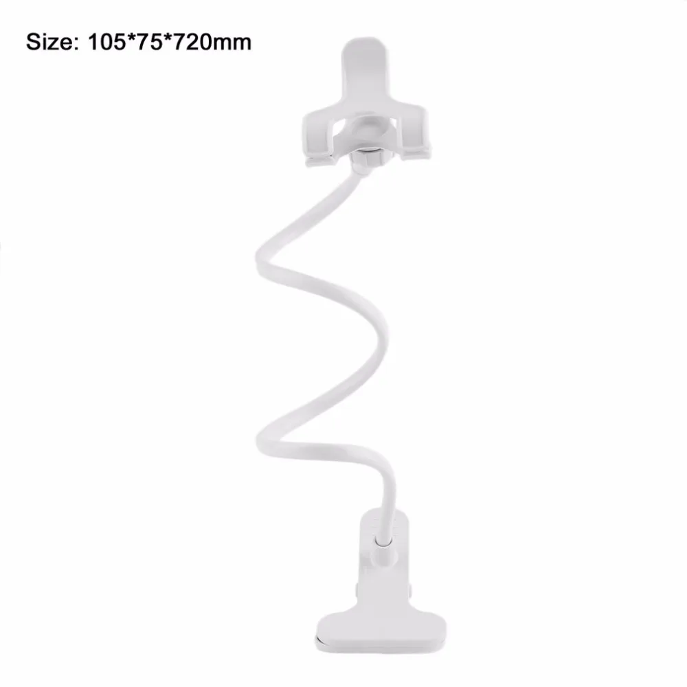 Особенности: Подходит для универсальных телефонов и размеров. Легко и просто наслаждаться вашим развлекательным временем. Можно положить в стол, стол, кровать и автомобиль. Регулируемый и гибкий дизайн, удобный для хранения. Материал прочный и безопасный в использовании. Характеристики: Размер: 105*75*720 мм Материал: пластик Цвет: черный, белый Посылка включает: 1 x держатель для телефона