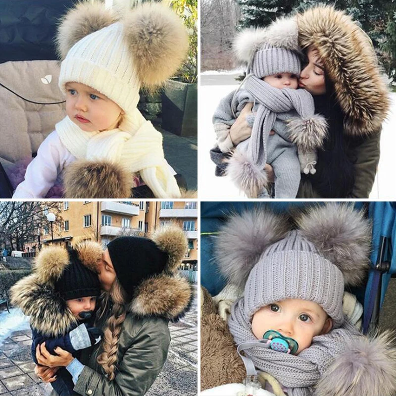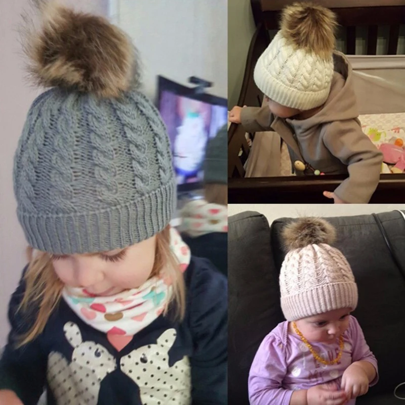 2021 модная детская вязаная шапка Зимний теплый шарф для новорожденных девочек мальчиков с пушистыми помпонами шариками однотонная теплая Милая облегающая шапка в подарок