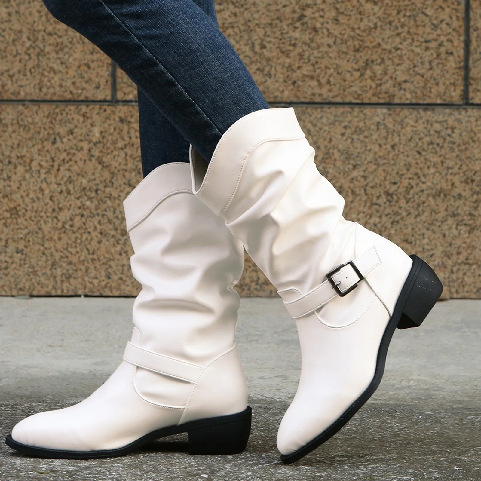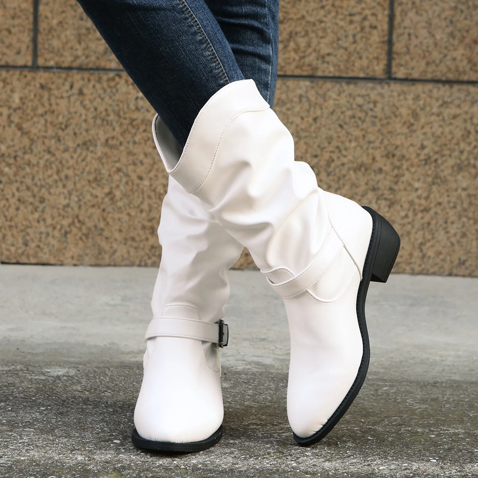 Ботинки женские однотонные, квадратный каблук, танкетка, пряжка, ремешок, средний каблук, круглый носок, модная обувь