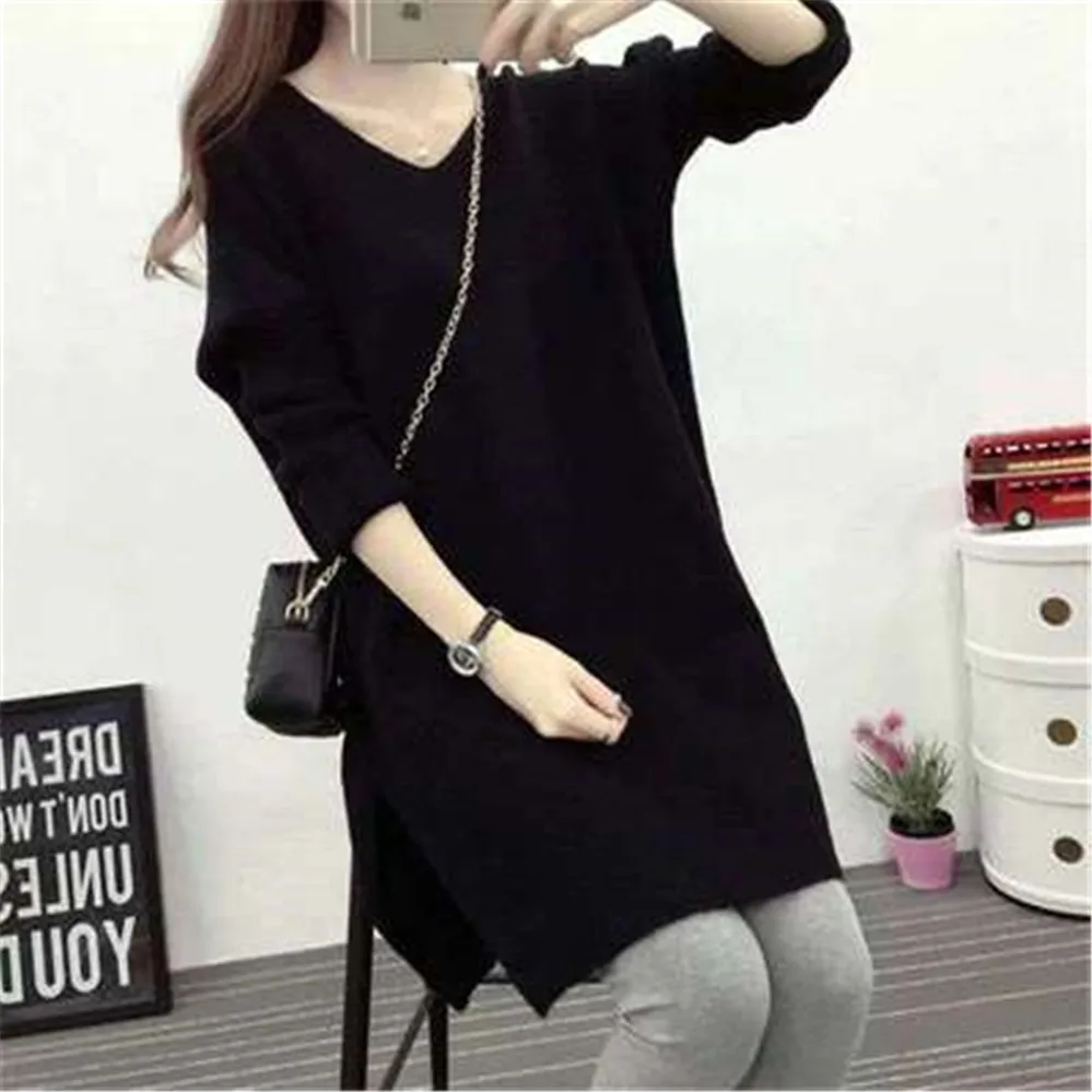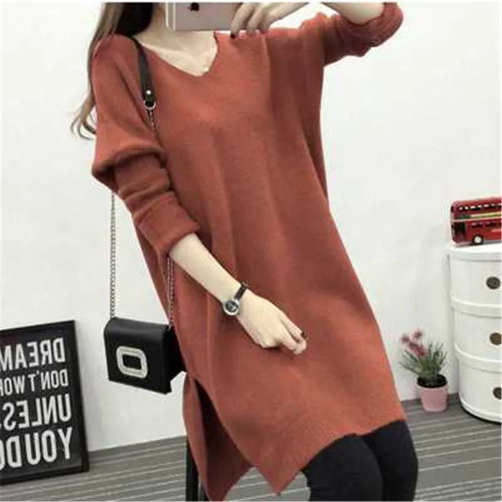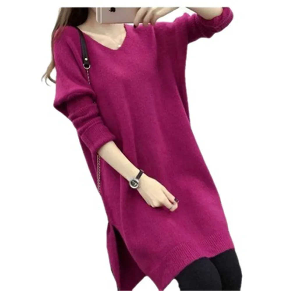 Женское вязаное платье-свитер с V-образным вырезом и длинным рукавом