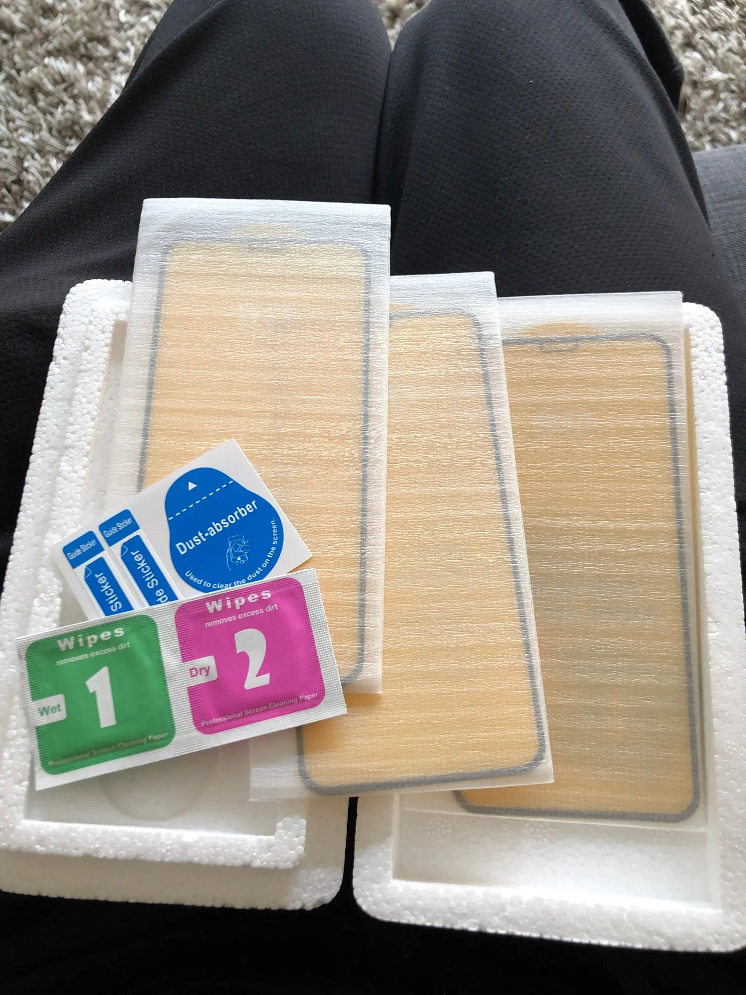 El paquete viene hecho con mucho mimo y en condiciones óptimas. Tiene los cuatro cristales, cada uno en su funda individual, cuatro toallitas húmedas, cuatro secas y cuatro packs de pegatinas para quitar las pelusas de la pantalla durante la aplicación. Todo ello en una caja protectora. Increíble. No me esperaba un producto tan bueno por tan poco precio. Además, la instalación del cristal ha sido muy fácil, la más fácil que he probado nunca, y no se han quedado burbujas incómodas. Increíble! Sin duda volveré a comprar cuando gaste estas cuatro!