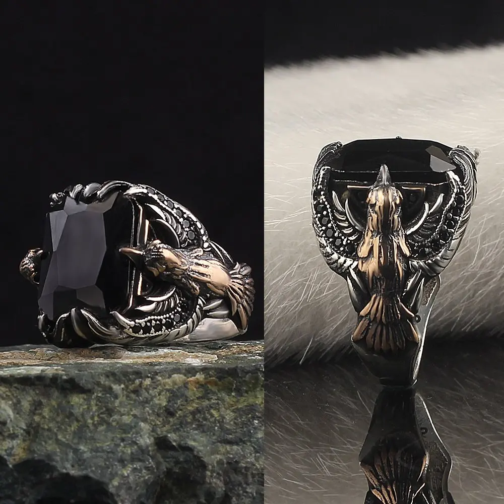 Женское серебряное турецкое ювелирное изделие ручной работы с дизайном орла, мужское кольцо из черного оникса, все размеры