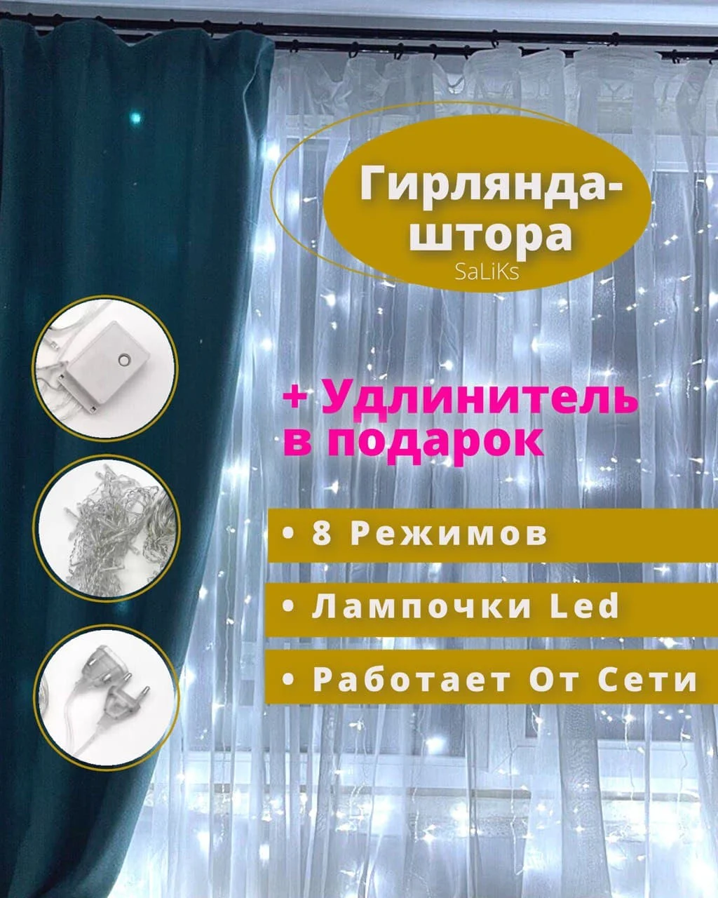 Лапочки LED (не нагреваются во время работы). Гирлянда работает от сети 220V. Есть возможность подключения дополнительных гирлянд.