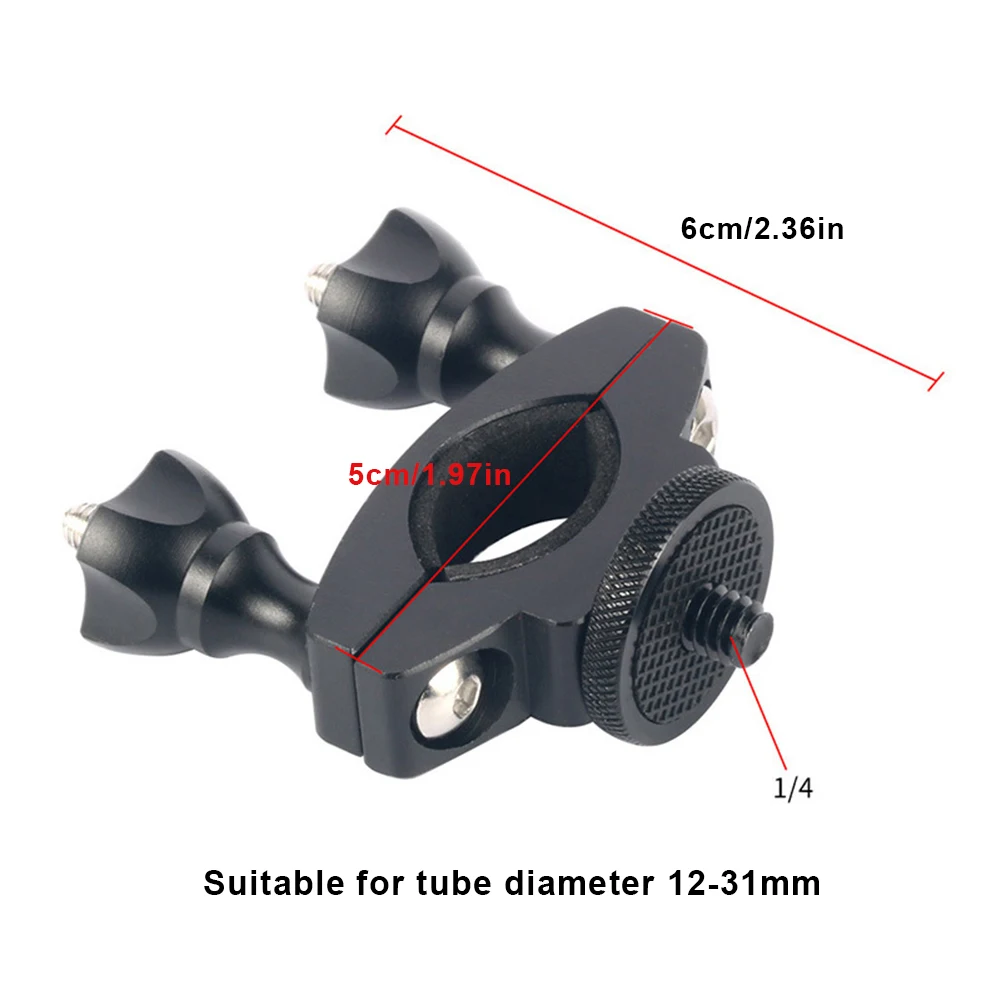 Feature:1、Highly compatible, suitable for 1/4" devices, 1/4 screw for other devices such as for OSMO Mobile 2 GOPRO/SJCAM/XIAOYI.2. Прочный, высококачественный алюминиевый сплав, стабильный и прочный, нелегко сломать. Ударопрочный и устойчивый к давлению.3 、 подходит для рам диаметром около 12-31 мм/0,47-1.22in, подходит для большинства моделей.4. Нескользящий коврик, устойчивый к царапинам, более близкий крой, хорошее трение и ударопрочность.5. Легко установить, дизайн ручки, свободно регулировать.Информация:Название: Универсальный кронштейн для велосипеда PTZМатериал: алюминиевый сплавРазмеры: около 6*5 см/2,36 * 1.97inВес: около 50 гОборудование для 1/4 винтаСписок: