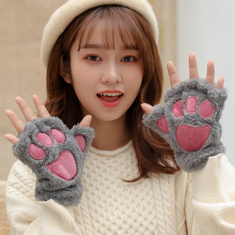Женские плюшевые перчатки с кошачьими лапами и медведем, зимние рукавицы без пальцев с милым котенком из искусственного меха, перчатки для рождества, Хэллоуина для женщин и девушек