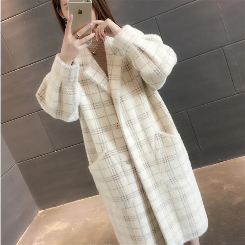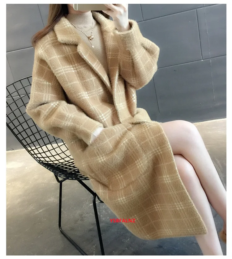 Осенне-зимнее клетчатое пальто из искусственной норки и кашемира, женское повседневное шерстяное пальто с большими карманами и отложным воротником, пальто, женская длинная верхняя одежда