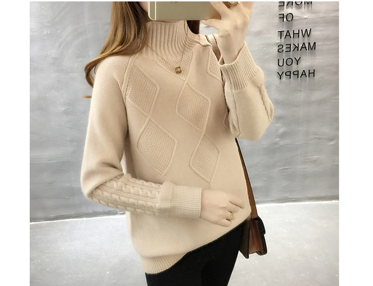 Осенний свитер с высоким воротником, Зимние Теплые Топы, женские вязаные свитера с длинным рукавом, однотонные Женские повседневные свободные пуловеры, топы