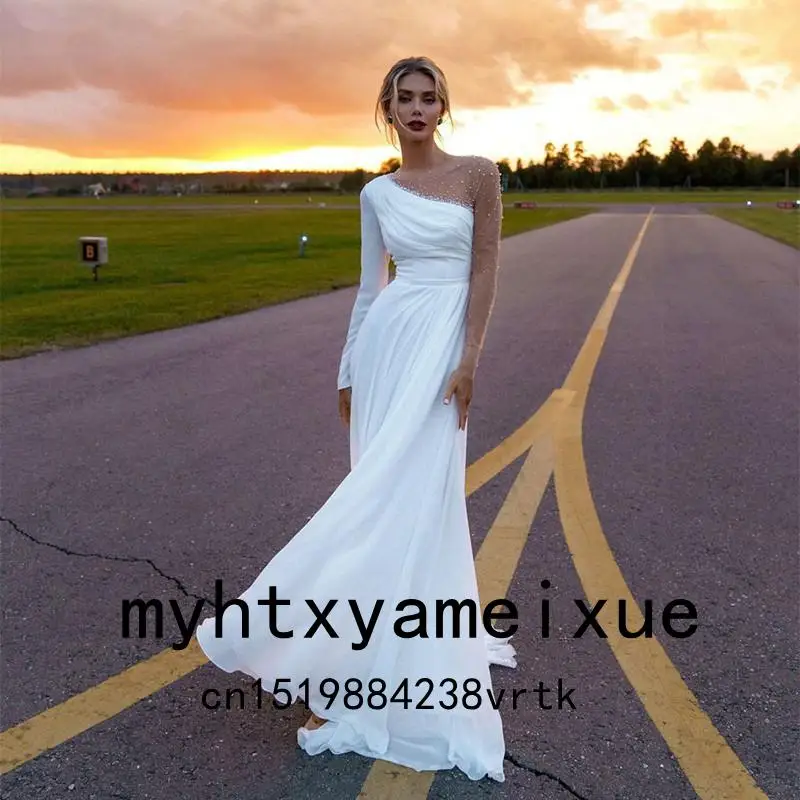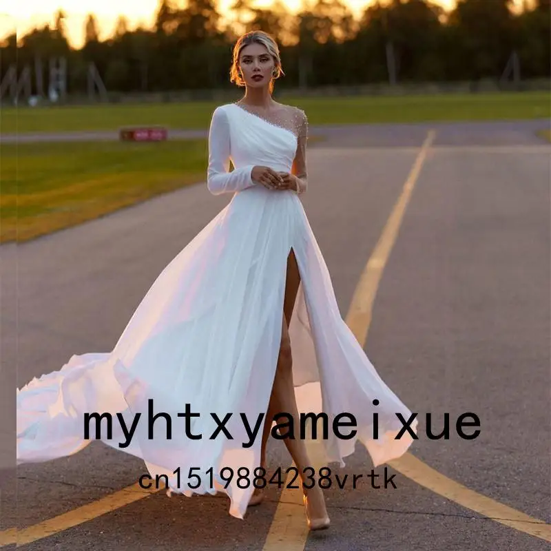 Женское белое шифоновое свадебное платье, сексуальные свадебные платья невесты с длинными рукавами, круглым вырезом и разрезом спереди, Украшенные бусинами, 2021