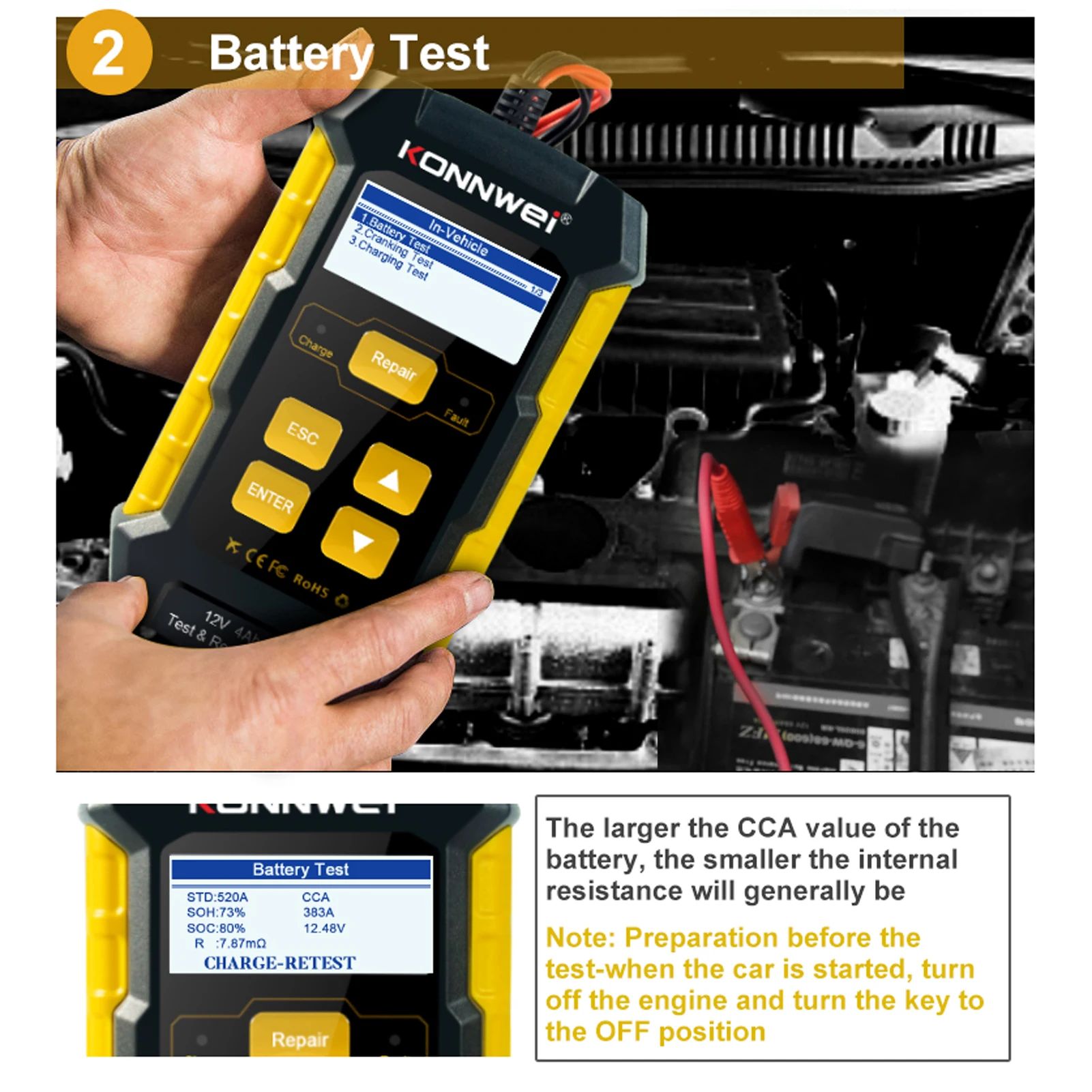 Тестер батареи KW510 + c-harger + repair-это новый аккумулятор-тестер, обновленный от черно-белого тестера, чтобы проверить состояние батареи быстрее и точнее, включая проверку рабочего состояния генератора. Не только поддерживает тест на здоровье батареи, но и поддерживает тест на проворот коленвала, тест на зарядку аккумулятора. Это профессиональный автомобильный диагностический инструмент для вашей батареи вопросов Графический текущий контроль уровня напряжения инструмент, 2,4 дюймовый цветной экран и с особенным орнаментом, этот продукт является идеальным для испытаний батарей инструмент для вас.Особенности:Поддержка автомобильного аккумулятора-проверка состояния и здоровья, зарядка и ремонт все в одном.Высокоточный тестер батареи.Функция импульсного ремонта помогает вам исправить и увеличить срок службы батареи и производительность.Настройки логического ключа, удобные и быстрые.2,4 дюймов Большой ЖК-дисплей экран на дисплее в виде буквы «r» итоге является чёткое и удобное даже при ярком в солнечные дни.Огнестойкий материал для безопасного и длительного использования.Характеристики:Вилка: штепсельная вилка европейского стандарта, штепсельная вилка британского стандарта, штепсельная вилка американского стандарта, штепсельная вилка австралийского стандарта (опционально)Цвет: желтый + черныйМатериал: АБС-пластикОбласть применения: 100-2000ccaЯзыки: английский, немецкий, французский, голландский, русский, испанский, итальянский, португальскийПосылка Вес: 703g / 1.5lbРазмер посылка: 190*150*70 мм/7,5*5,9*2,8 дюймовУпаковочный лист:1 * тестер автомобильного аккумулятора1 * Руководство пользователя1 * кабель питания
