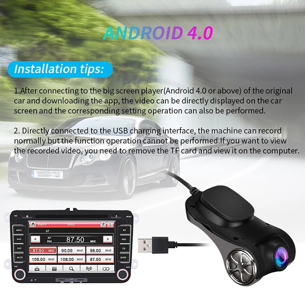 Автомобильный видеорегистратор ADAS, 1080P, FHD, видеорегистратор, 170, ночное видение, USB, Автомобильный видеорегистратор для Android 4,0, вышеОсобенности1. Поддержка автоматического включения, чтобы начать запись видео после запуска автомобиля.2. Поддержка обнаружения движения/циклическая запись встроенный файл установки APK для автомобильного мобильного соединения.3. Система: Android 4,0 выше большого экранного навигатора.4. Поддержка автомобильной и мобильной связи, подключение приложений, интеллектуальная система ассистента ADAS.5. Угол вращения объектива: Поддержка ручного вращения вверх и вниз на 60 °.6. Внешнее хранилище: Поддержка TF 8G ~ 32G (не входит в комплект).