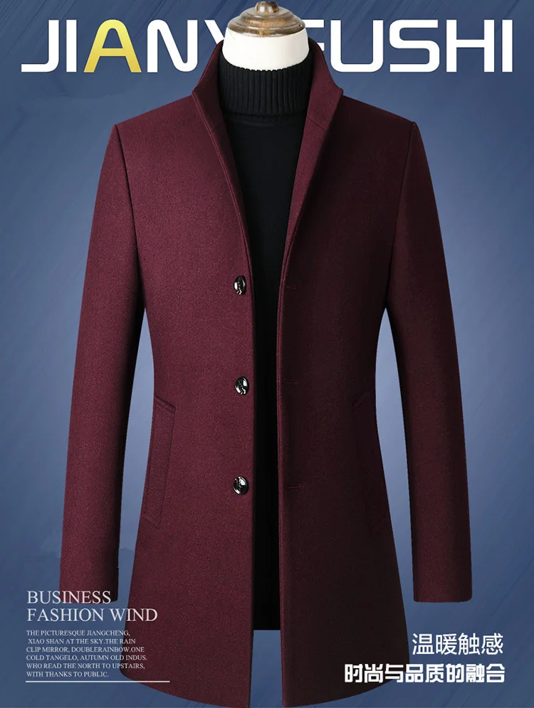 Мужская простая однотонная ветровка с воротником-стойкой, мужское шерстяное пальто средней и длинной длины