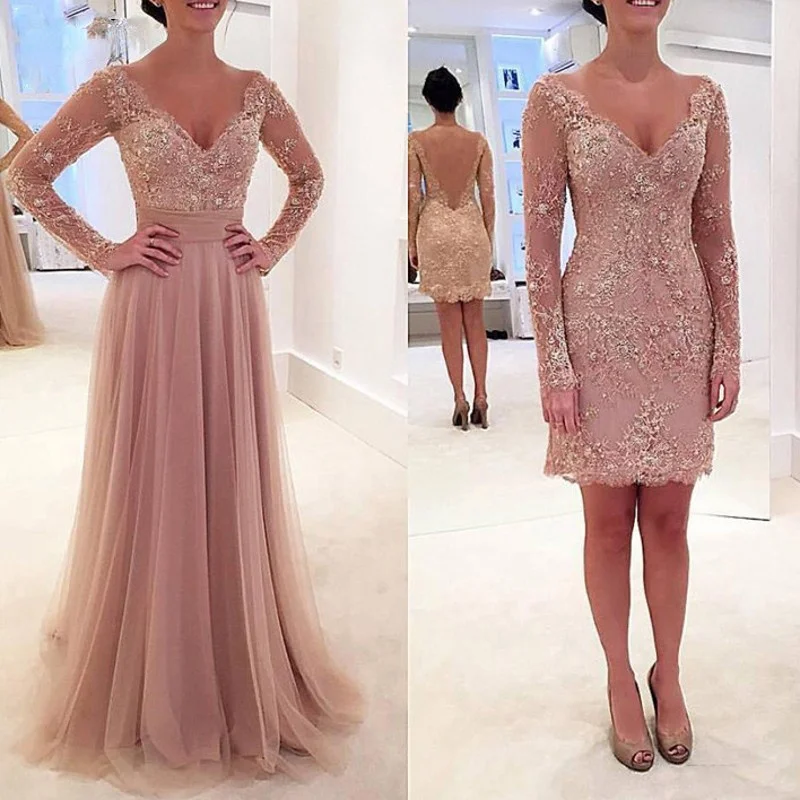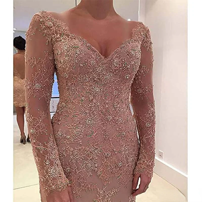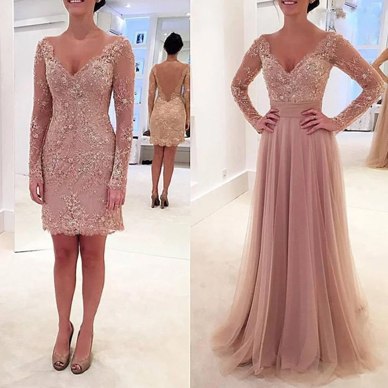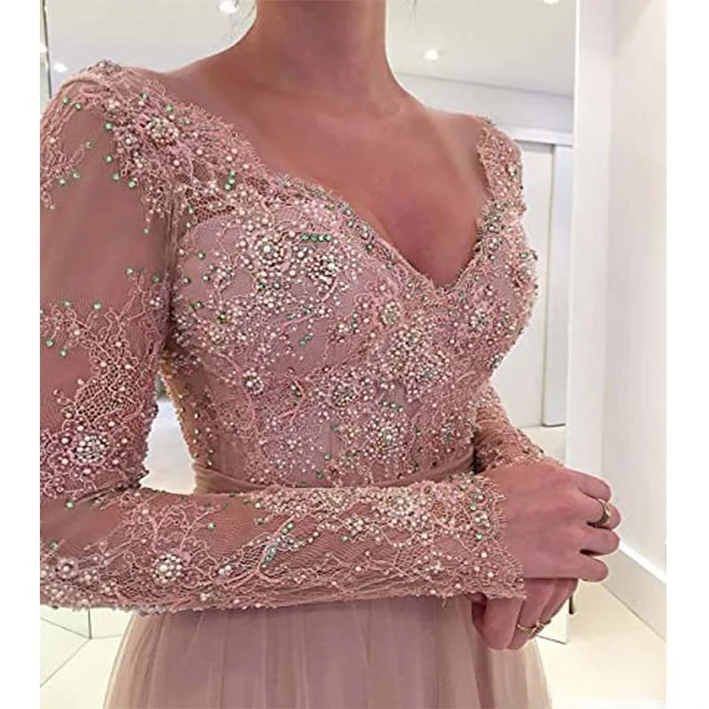 Платье для матери невесты 2 в 1, с V-образным вырезом, бисером, длинным рукавом, со съемным шлейфом, пыльное розовое вечернее платье