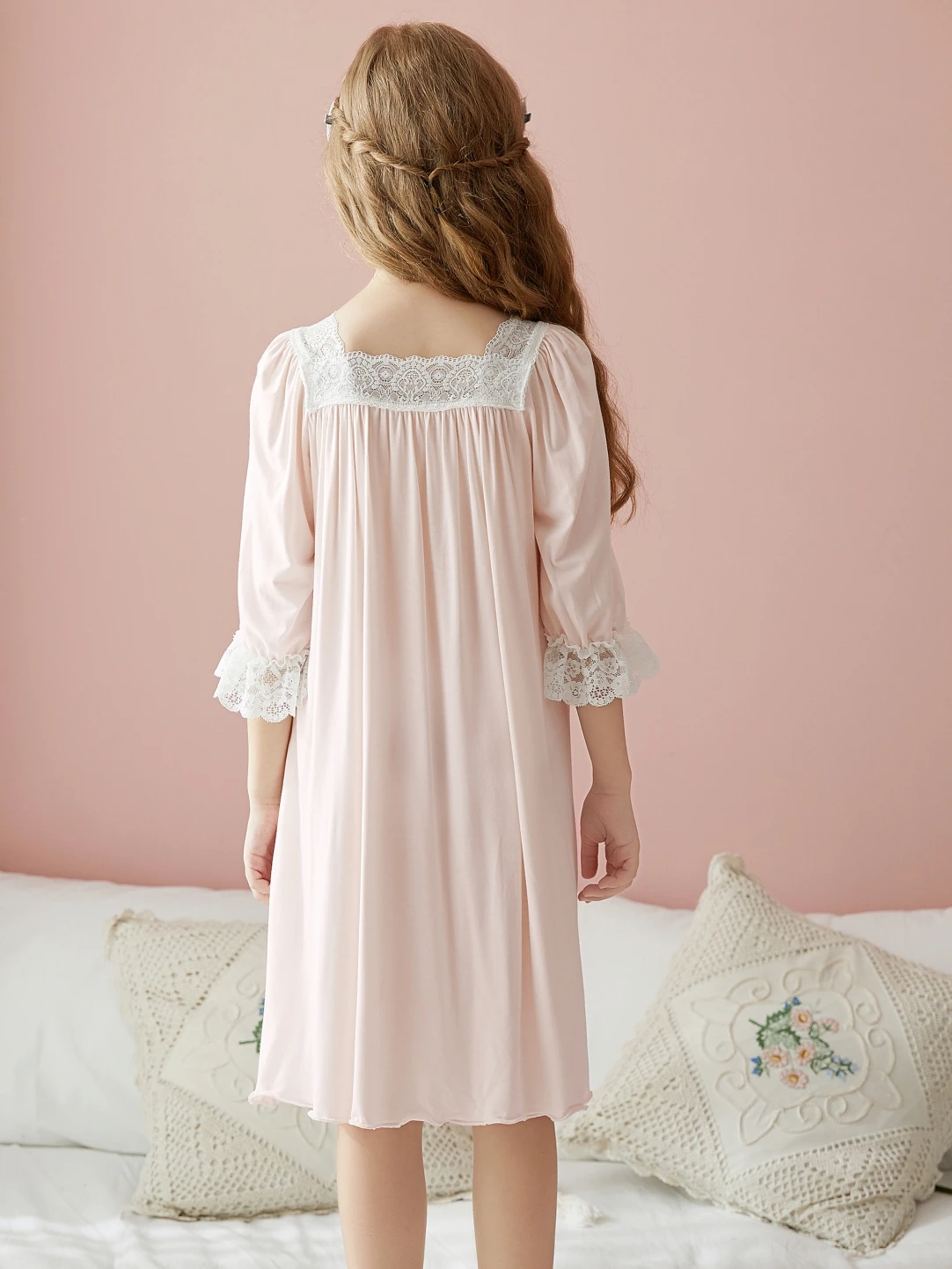 Детское розовое платье принцессы, одежда для сна, рубашки для сна с квадратным вырезом, винтажная детская кружевная ночная рубашка, летняя хлопковая ночная рубашка для девочек