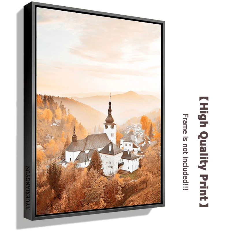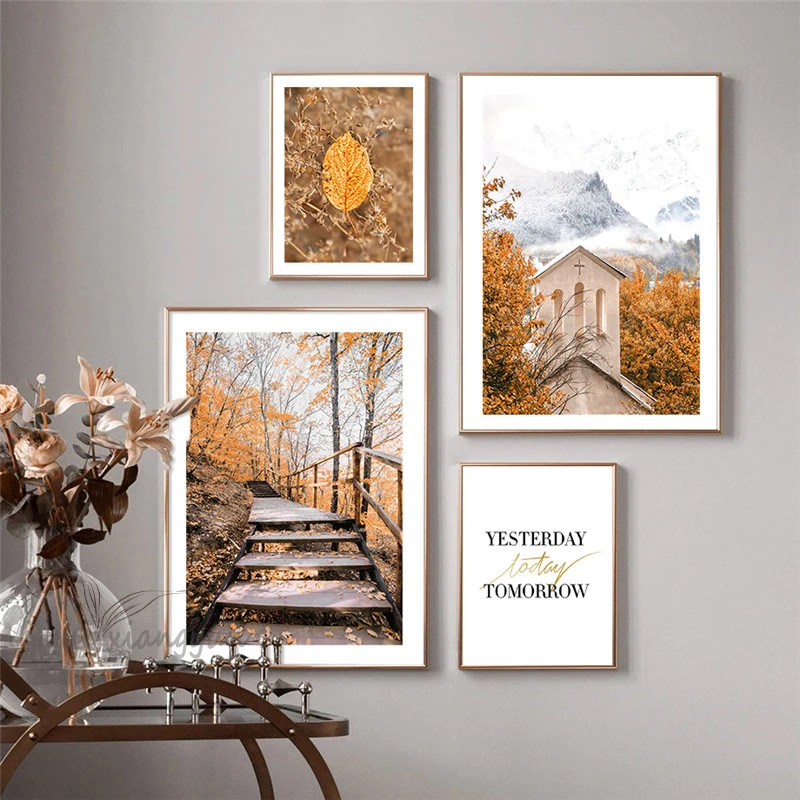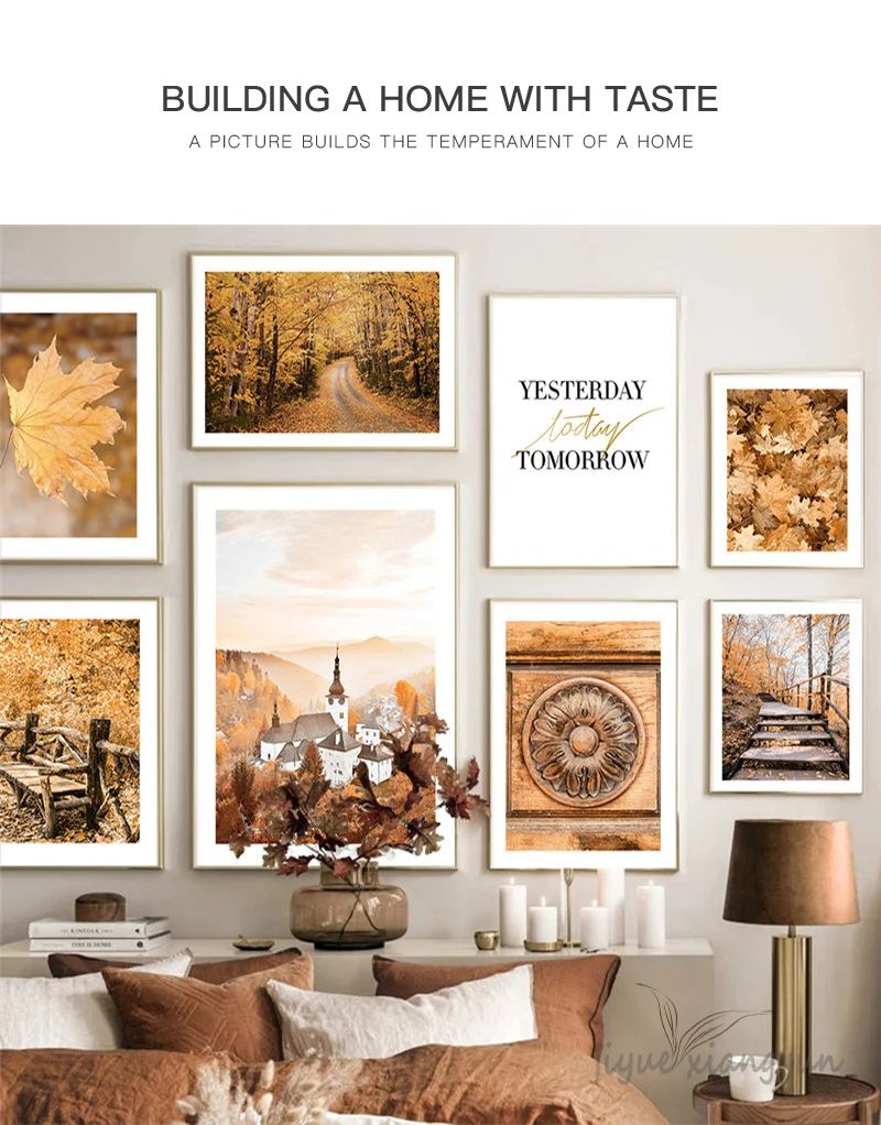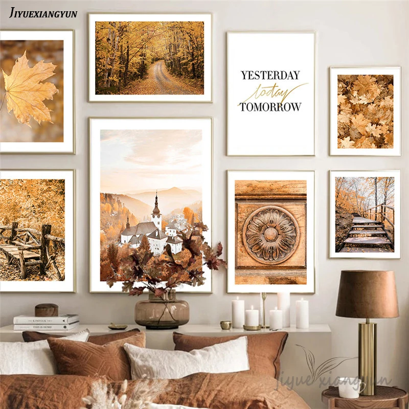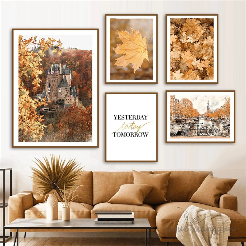 Осенний пейзаж природы кленовый лист сосна лес замок скандинавский настенный художественный холст живопись плакаты и принты современный декор для гостиной