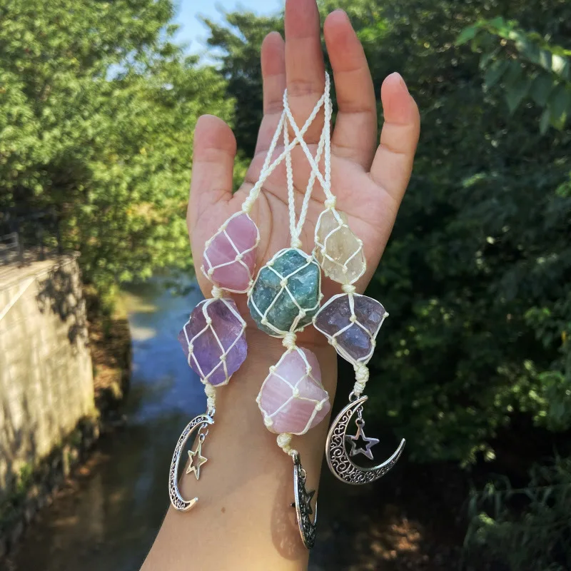 Натуральный хрустальный камень, подвесное украшение для автомобиля, луна, звезда, необработанный минеральный розовый кварц, аметист, драгоценный камень, кисточка, лечебный настенный Декор для дома