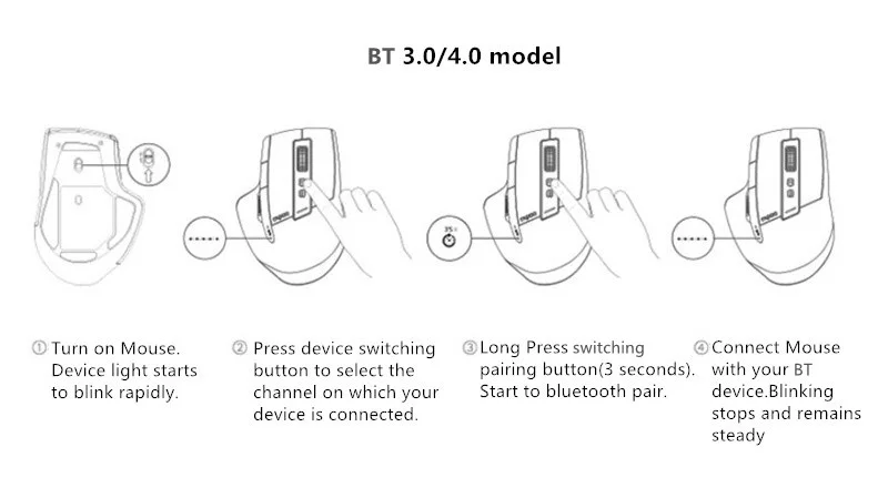 2,4 г:1. Подключите приемник Rapoo.2. Включите мышь.3. Сделано.Совместимость с Bluetooth 3,0 и 4,0:1. Включите мышь. Светильник устройства начинает быстро мигать.2. Нажмите кнопку переключения устройства, чтобы выбрать канал, на котором подключено ваше устройство.3. Нажмите кнопку включения-сопряжения> 3 секунды. Светильник устройства начинает медленно мигать.4. Подключите мышь к устройству. Мигание останавливается и остается устойчивым в течение 6 секунд.5. Сделано.Пожалуйста, внимательно прочитайте руководство пользователя перед подключением или свяжитесь с нами, и мы ответим в течение 24 часов.