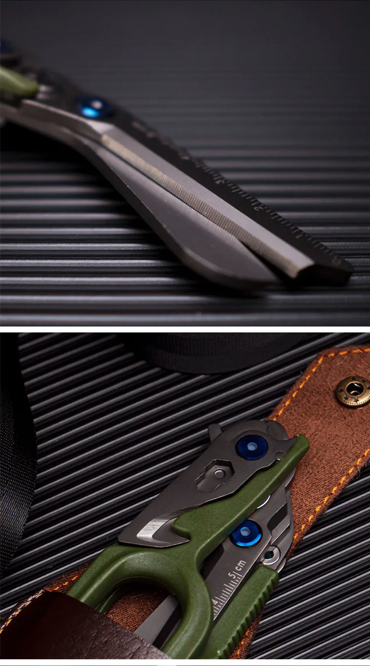 1. С обычной функцией стрижки.2. Имеет функцию открывания бутылок.3. Может отрезать тонкий металлический лист.4. Может быстро отрезать ремень безопасности автомобиля, чтобы избежать.5. Функция молотка безопасности.6. Компактный и легкий, легко носить с собой.