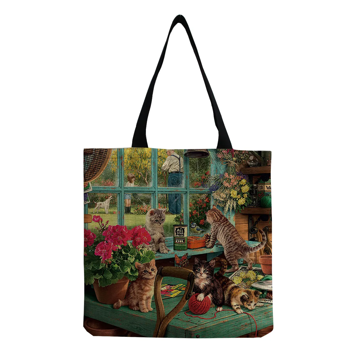 Сумка-тоут женская льняная с принтом кошки и маслом