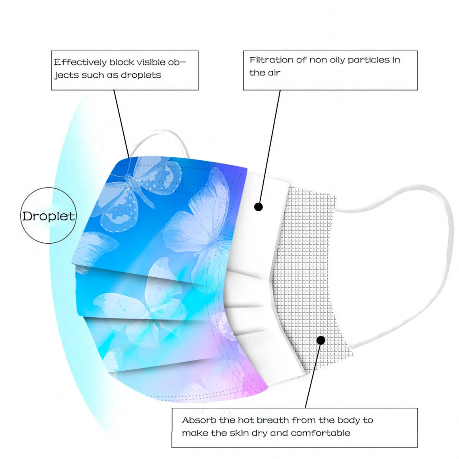 В3 слоя Нетканая одноразовая маска изготовлена из 3 слоев нетканого материала,Безопасен и безопасен для использования. Дышащий материал и милыйУзоры, которые делают его полезным и модным. Специальный 3 слоя из нетканого материалаДизайн, обеспечивает некоторую защиту от пыли, автомобильных выхлопных газов,Пыльца и т. д. эластичная Ушная петля, легко носить и не давит на уши.Маникюрный салон или любые другие области, где может потребоваться защита