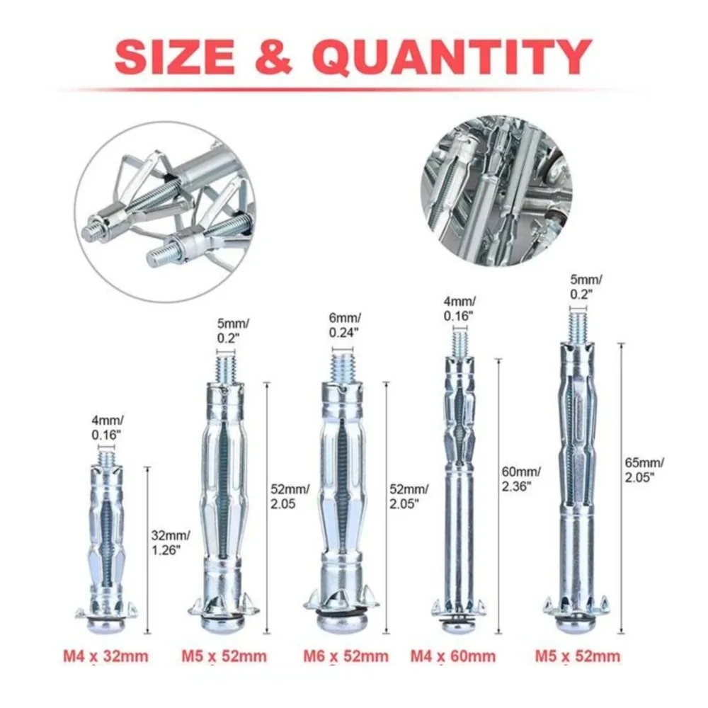 Широкий спектр примененияИдеально подходит для фиксации анкерного гипсокартона, широко используется в гипсокартоне, полых блоках, штукатурке, плитке, идеально подходит для подвесных штор, ламп, фоторамок, вешалок для пальто, выключателей питания. Удобно для вашей повседневной жизни.