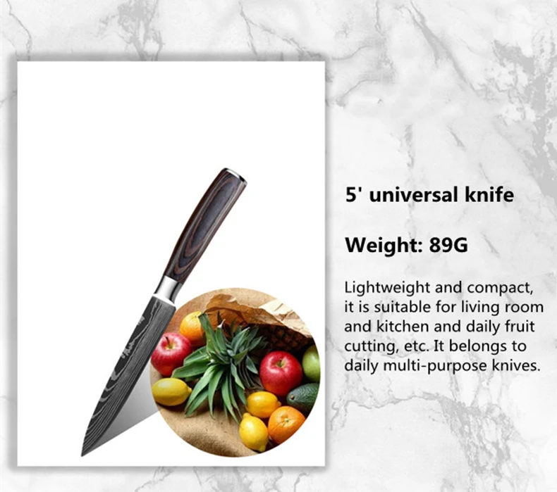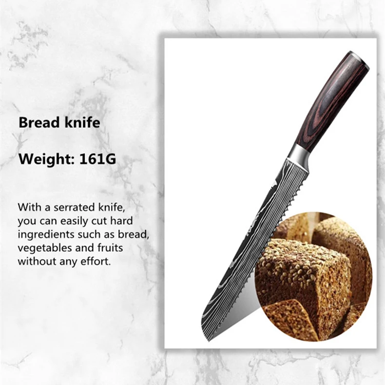 Материал лезвия: 5Cr15Mov высокоуглеродистая Нержавеющая стальМатериал ручки: Pakka дерево/цвет древесиныТвердость лезвия: HRC 55 ± 2Размеры лезвия:1*8 дюймов Kiritsuke нож1*7 дюймов Ножи накири1*8 дюймовый нож шеф-повара1*7 дюймов нож Santoku1*8 дюймовый разделочный нож1*8 дюймовый нож для хлеба1 * 6-дюймовый нож обвалочный нож1*5 дюймов нож Santoku Ножи1*5 дюймов нож1*3,5 дюймовый нож для очистки овощей