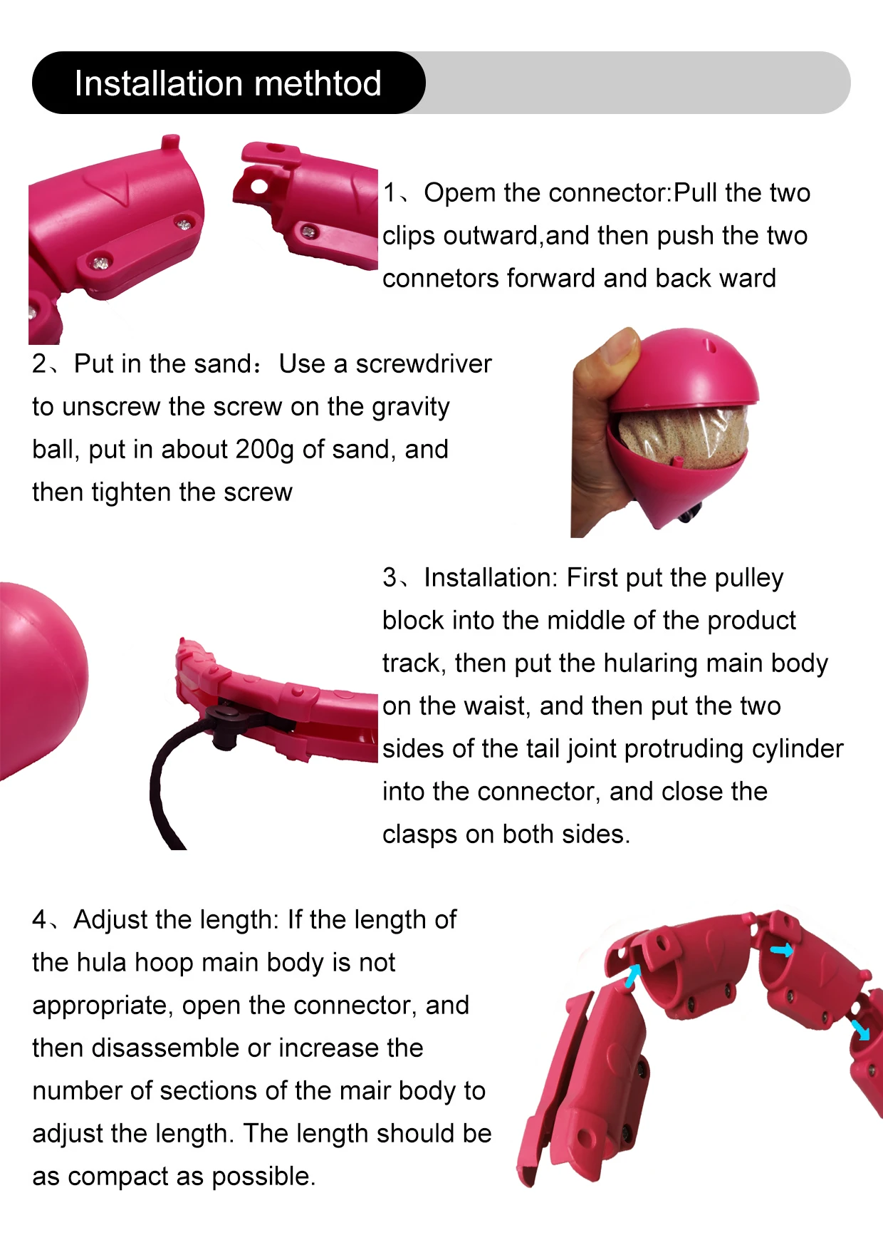 Обруч может быть составлен из секций, которые могут увеличить или уменьшить количество слайдов на основной части тела для регулировки размера талии.