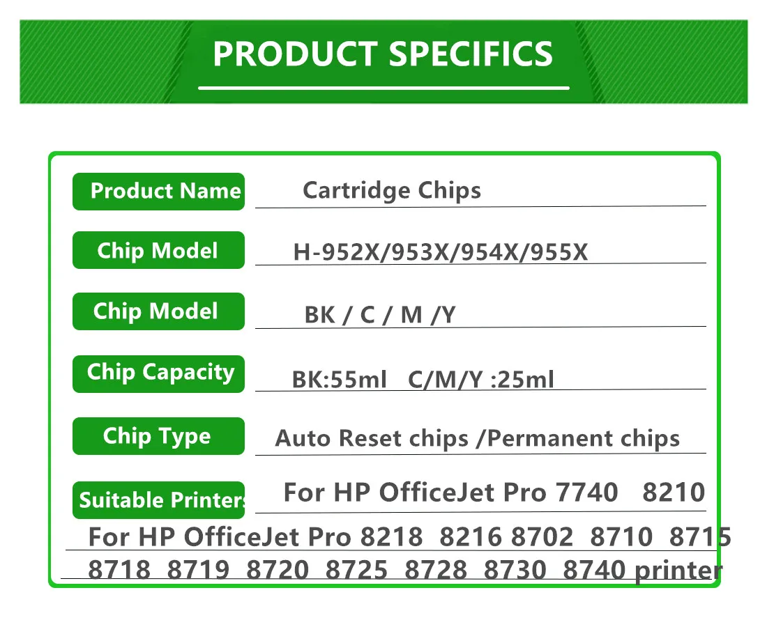 Название продукта: чипы картриджа, чипы ARCМодель чипа:Для HP 952 / 953 / 954 / 955Для HP 952X / 953X / 954X / 955X