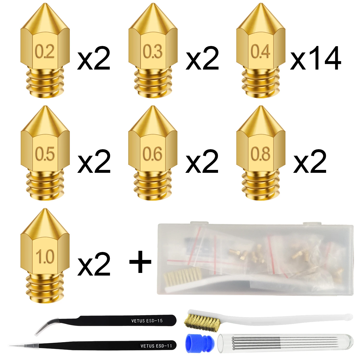 Набор насадок MK8, 26 шт., игла для чистки латунного экструдера M6, 0,2, 0,3, 0,4 мм, 0,5, 0,6, 0,8, 1,0 мм, Hotend, сопла для 3D-принтера 1,75 мм