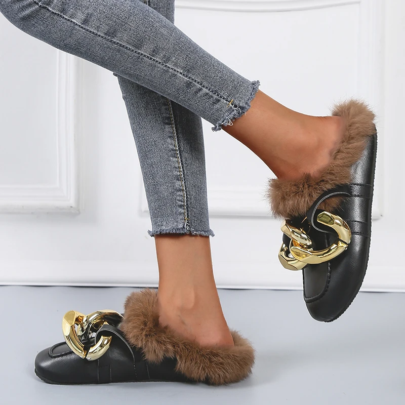 Мюли LazySeal женские зимние с натуральным мехом, туфли на металлической цепочке, лоферы, повседневная обувь с круглым носком, пушистые шлепанцы, пушистые волосатые шлепанцы