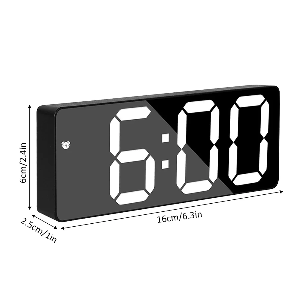 Цифровой будильник светодиодный экран будильники большой зеркальный дисплей USB функция повтора настольные часы домашний Декор светодиодный часы Особенности: 1. Большой Цифровой Дисплей: 3 ''светодиодный Большой цифровой дисплей, четкий и удобный визуальный эффект, он автоматически тускнеет от 10:00 pm-6:00 am. При подключении к usb-кабелю светодиодный светильник всегда будет включаться. При нажатии кнопки «SNOOZELIGHT» дисплей может держать освещение в течение 5 секунд. 2. Тихая Спящая среда: В отличие от Механическая сигнализация, которая продолжает тикать, влияет на качество вашего сна. Часы тихие, что позволяет избавиться от шума ночи и спокойно спать. 3. Питание от сети переменного тока и батареи резервного копирования: вставьте шнур питания USB (не включая адаптер) или вставьте три батарейки AAA для зарядки часов. Во время резервного копирования батареи экран будет черный, настройки будильника и Времени останутся, и будильник будет по-прежнему звучать. При использовании питания батареи, может быть активирован, и дисплей может быть включен, хлопая руками, и он автоматически выходит После 16s. 4. Сигналы тревоги с повтором: сигналы тревоги позволяют установить два отдельных времени пробуждения. Время повтора может быть установлено, не нужно вручную выключать будильник. Разбудите вас в разное время, сделайте вашу жизнь легкой и удобной. 5. Стильный и простой дизайн: Размеры: 16 × 2,5 × 6 см, стильный и простой мини зеркальные часы-будильник может украсить ваш спальня, гостиная. Характеристики: Тип: цифровой будильник Материал: АБС-пластик Цвет корпуса: черный Цвет слов: белый, красный, зеленый Размер дисплея: 16 см * 6 см/6,3 дюйма * 2,4 дюйма Регулировка яркости: автоматически или вручную Формат времени: Переключение 12/24 часов Продолжительность повтора: 1-60 минут Температура: -10 ℃ ~ 50 ℃/14 °F ~ 122 °F Температурный режим: ℃/°F Порт USB для зарядки: 5 В Питание by3 * AAA батареи (не включая) или USB кабель 5 клавиш: режимы, будильник, вверх, вниз, Повтор/светильник Продукт Размеры: 16 см x 6 см x 2,5 см/6.3in x 2.4in x 0.98in Посылка включает в себя: 1 x цифровые часы 1 х USB кабель
