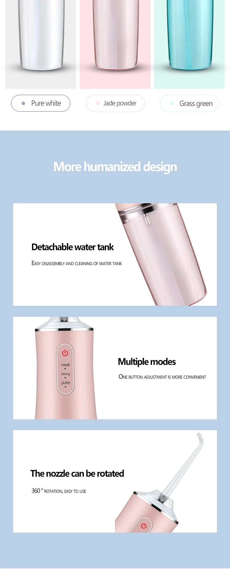 2. Удобный и съемный дизайн резервуара для воды позволяет вовремя очистить грязь в резервуаре для воды, что делает очистку зубов более гигиеничной