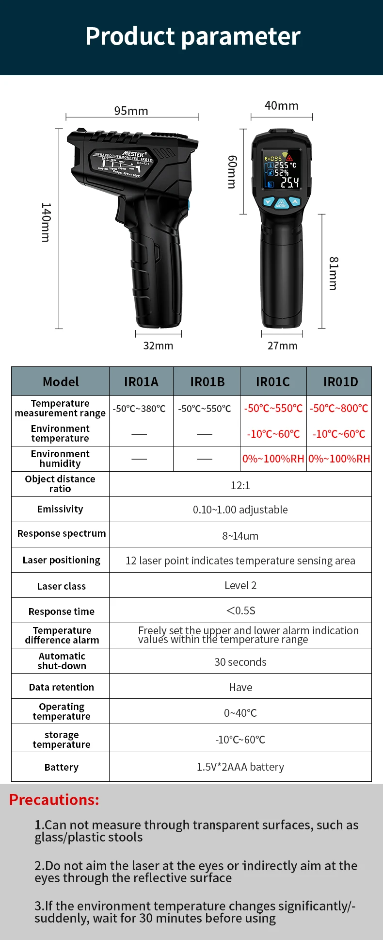 D:S : 12:1Излучение: 0,1 ~ 1,00 регулируемаяДиапазон отклика: 8 ~ 14 мкмЛазерное позиционирование: 12 точечное кольцо, указывающее температуру чувствительной зоныЛазер: 1 мВт/630-670нм Уровень 2Время отклика: 0.5sАвтоматическое выключение: 30 секундХранение данных: естьТемпература обслуживания: 0 ~ 40CТемпература хранения:-10 ~ 60CПримечание: батарея в комплект не входитIR03A/IR03B: только одна лазерная точкаIR01C/IR01D/IR02C:12 лазерных точек