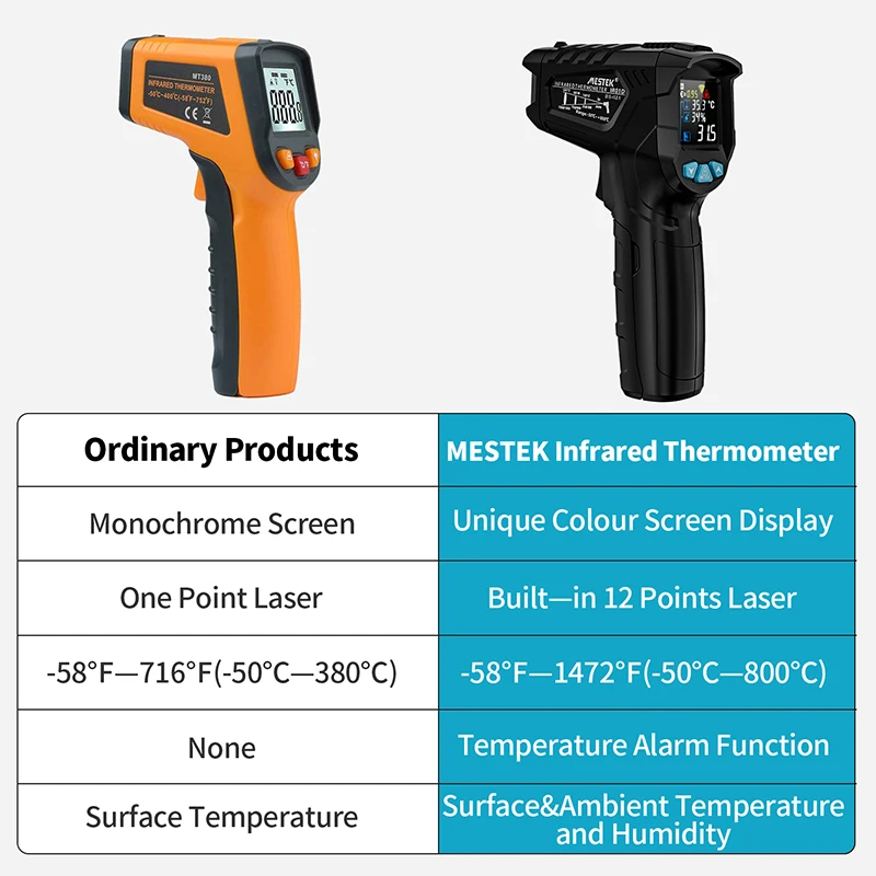 Цифровой инфракрасный термометр MESTEK, Бесконтактный измеритель температуры и влажности с цветным ЖК-дисплеем и сигнализацией, IR02C