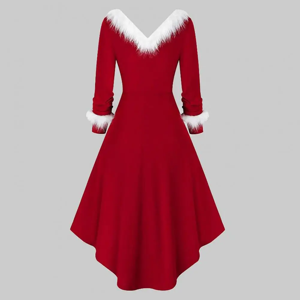 Двухстороннее праздничное платье с V-образным вырезом, белое плюшевое платье с высоким и низким подолом в стиле пэчворк, облегающее рождественское платье с широким подолом, костюм для косплея