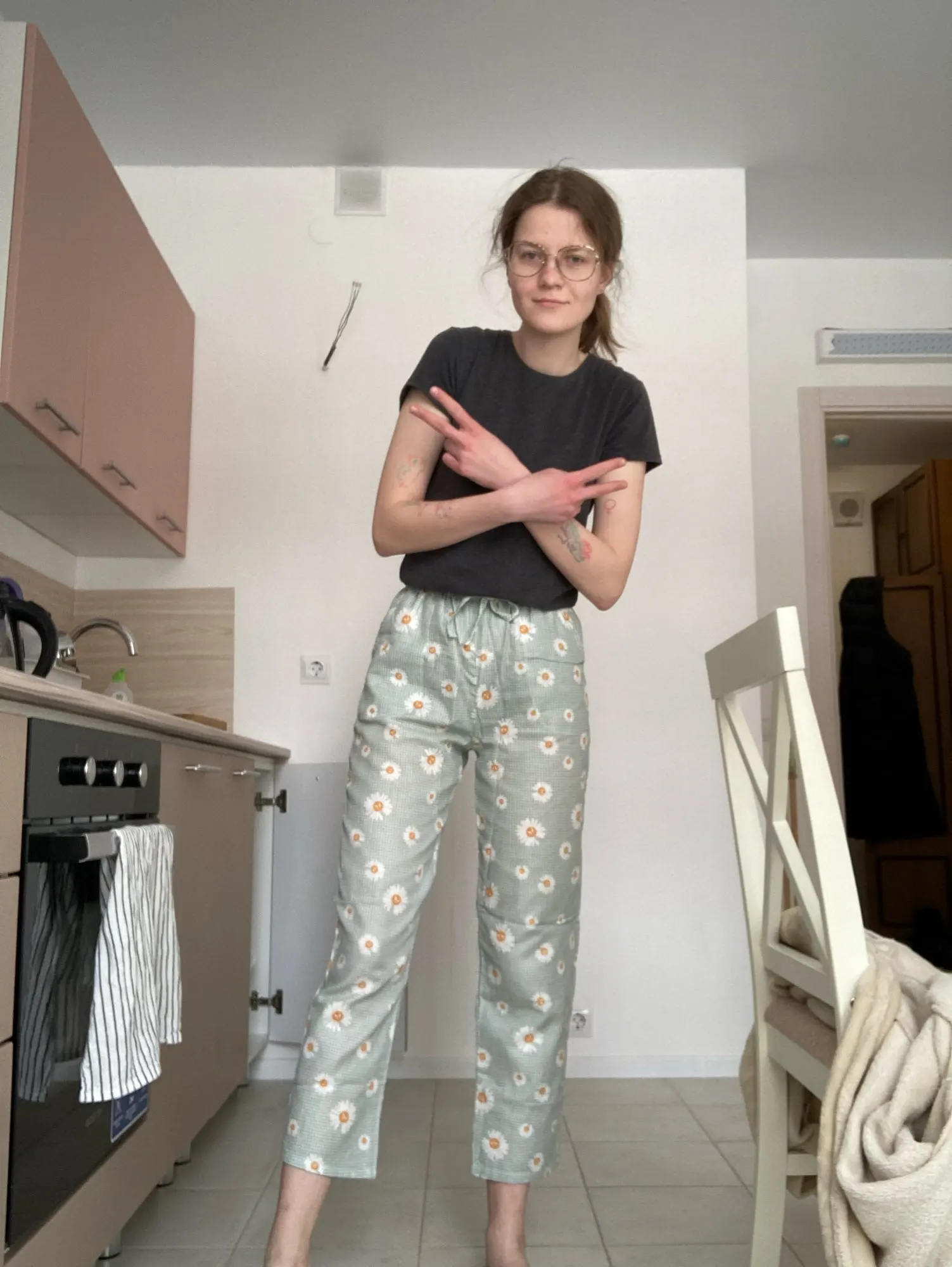 Воздушные, легкие и тонкие брюки из ткани. Идеально подходит для лета, хорошо сидит и растягивается, поэтому вам не придется беспокоиться о наших точных измерениях. Цвет выглядит точно так же, как на фотографиях. Ткань немного шероховатая/текстурированная (?), но это не мешает мне.