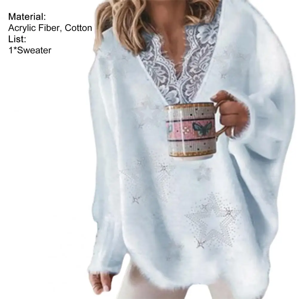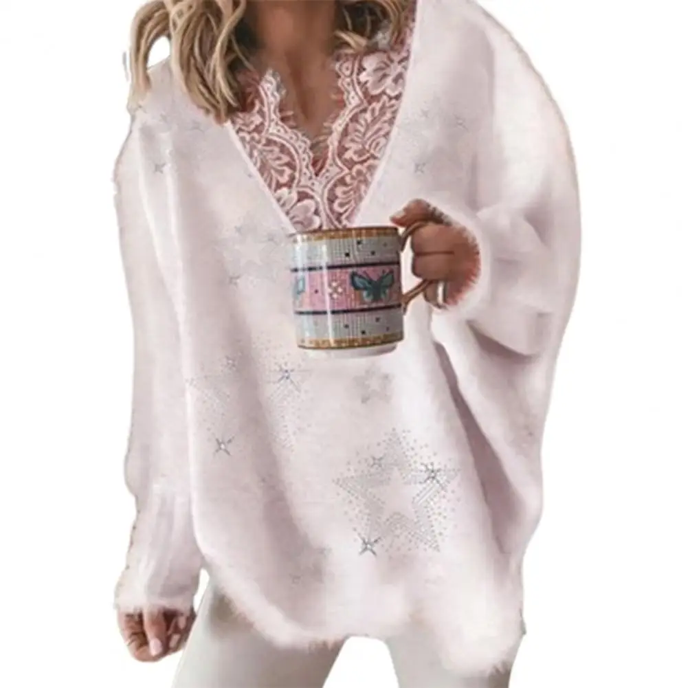 Женский Однотонный свитер оверсайз с V-образным вырезом, с кружевом