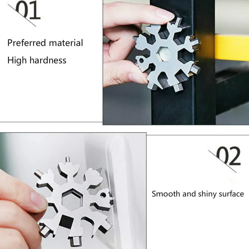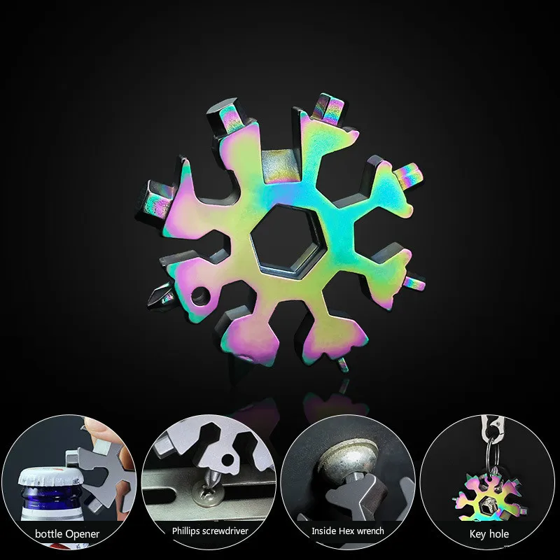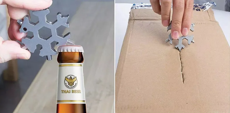 -Изготовлен из нержавеющей стали, уникальный дизайн в форме снежинки-Портативный и легкий, используется для крепления к брелкам или рюкзакам-Многоразовое использование, может использоваться для открытия пивной бутылки, поворота винта, фиксации сноуборда, велосипеда, игрушек и т. д.-Используйте как плоскую отвертку, крестовую отвертку, торцевой ключ и т. д.-Отлично подходит для занятий спортом на открытом воздухе, кемпинга, походов, посадки, приключений, путешествий и многого другого.