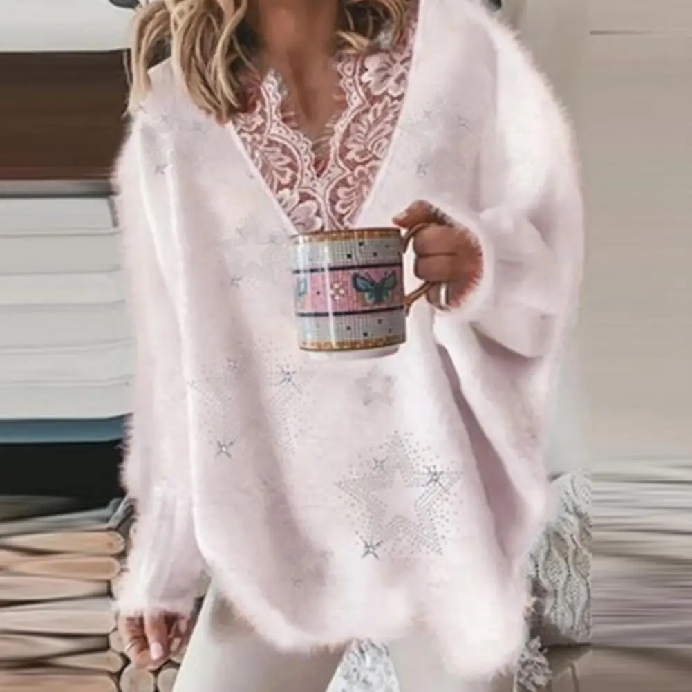 Женский Однотонный свитер с кружевным вырезом, осенне-зимний свитер с V-образным вырезом и пятиконечным звездочным узором, повседневная одежда, Прямая поставка, 2021
