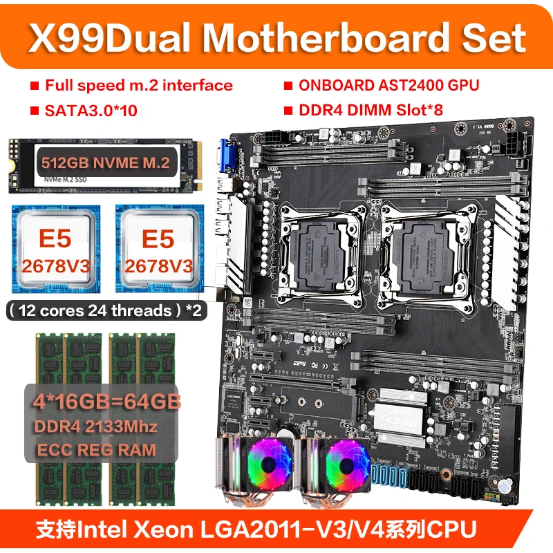 Номер моделиX99DUAL+2678V3*2+16GB 2133*4+cooler*2+512M.2 SSD