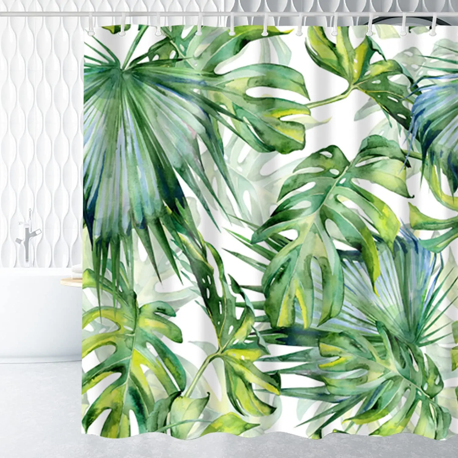 Тропические занавески для душа с зелеными листьями, набор акварельных занавесок с листьями ладони на белом фоне, занавески для ванной из полиэстера с крючками